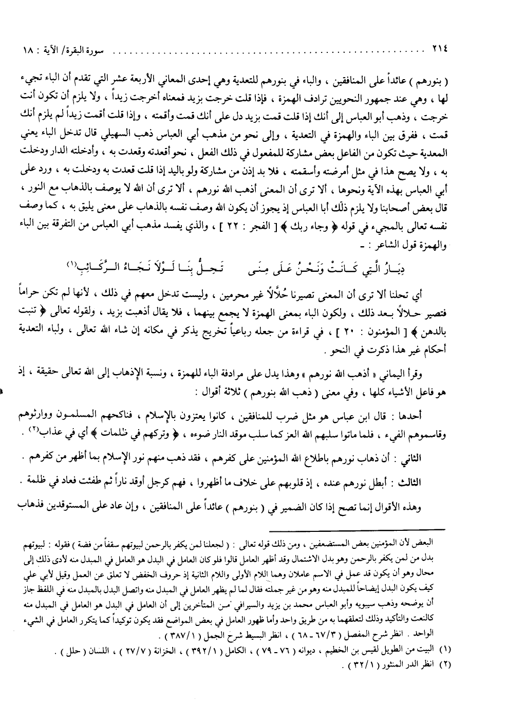 بنورهم عائداً على المنافقين . والباء في بنورهم للتعدية ، وهي إحدى المعاني الأربعة عشر التي تقدم أن الباء تجيء لها ، وهي عند جمهور النحويين ترادف الهمزة . فإذا قلت : خرجت بزيد ؛ فمعناه أخرجت زيداً ، ولا يلزم أن تكون أنت خرجت ، وذهب أبو العباس إلى أنك إذا قلت : قمت بزيد ، دل على أنك قمت وأقمته ، وإذا قلت : أقمت زيداً ، لم يلزم أنك قمت ، ففرق بين الباء والهمزة في التعدية . وإلى نحو من مذهب أبي العباس ذهب السهيلي ، قال : تدخل الباء ، يعني المعدية ، حيث تكون من الفاعل بعض مشاركة للمفعول في ذلك الفعل نحو : أقعدته ، وقعدت به ، وأدخلته الدار ، ودخلت به ، ولا يصح هذا في مثل : أمرضته ، وأسقمته . فلا بد إذن من مشاركة ، ولو باليد ، إذا قلت : قعدت به ، ودخلت به . ورد على أبي العباس بهذه الآية ونحوها . ألا ترى أن المعنى أذهب الله نورهم ؟ ألا ترى أن الله لا يوصف بالذهاب مع النور ؟ قال بعض أصحابنا ، ولا يلزم ذلك أبا العباس : إذ يجوز أن يكون الله وصف نفسه بالذهاب على معنى يليق به ، كما وصف نفسه تعالى بالمجيء في قوله : ) وَجَاء رَبُّكَ ( ، والذي يفسد مذهب أبي العباس من التفرقة بين الباء والهمزة قول الشاعر : ديار التي كانت ونحن على منى
