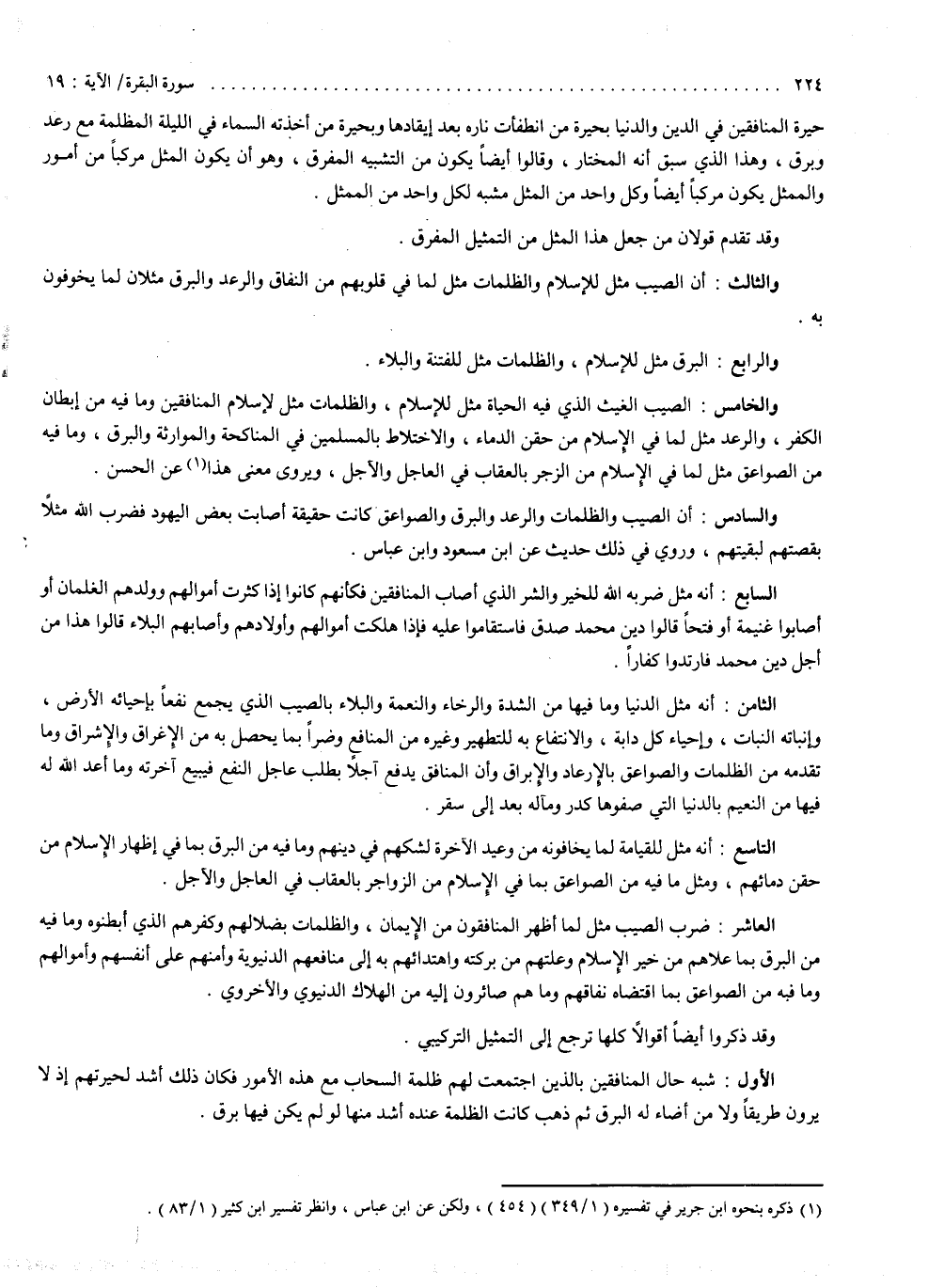 وقد تقدم قولان من جعل هذا المثل من التمثيل المفرق . والثالث : أن الصيب مثل للإسلام والظلمات ، مثل لما في قلوبهم من النفاق والرعد والبرق ، مثلان لما يخوفون به . والرابع : البرق مثل للإسلام والظلمات ، مثل للفتنة والبلاء . والخامس : الصيب : الغيث الذي فيه الحياة مثل للإسلام والظلمات ، مثل لإسلام المنافقين وما فيه من إبطان الكفر ، والرعد مثل لما في الإسلام من حقن الدماء والاختلاط بالمسلمين في المناكحة والموازنة ، والبرق وما فيه من الصواعق مثل لما في الإسلام من الزجر بالعقاب في العاجل والآجل ، ويروى معنى هذا عن الحسن . والسادس : أن الصيب والظلمات والرعد والبرق والصواعق كانت حقيقة أصابت بعض اليهود ، فضرب الله مثلاً بقصتهم لبقيتهم ، وروي في ذلك حديث عن ابن مسعود ، وابن عباس . السابع : أنه مثل ضربه الله للخير والشر الذي أصاب المنافقين ، فكأنهم كانوا إذا كثرت أموالهم وولدهم الغلمان ، أو أصابوا غنيمة أو فتحاً قالوا : دين محمد صدق ، فاستقاموا عليه ، وإذا هلكت أموالهم وأولادهم وأصابهم البلاء قالوا : هذا من أجل دين محمد ، فارتدوا كفاراً . الثامن : أنه مثل الدنيا وما فيها من الشدة والرخاء والنعمة والبلاء بالصيب الذي يجمع نفعاً بإحيائه الأرض وإنباته النبات وإحياء كل دابة والانتفاع به للتطهير وغيره من المنافع ، وضراً بما يحصل به من الإغراق والإشراق ، وما تقدمه من الظلمات والصواعق بالإرعاد والإبراق ، وأن المنافق يدفع آجلاً بطلب عاجل النفع ، فيبيع آخرته وما أعد الله له فيها من النعيم بالدنيا التي صفوها كدر ومآله بعد إلى سفر . التاسع : أنه مثل للقيامة لما يخافونه من وعيد الآخرة لشكهم في دينهم وما فيه من البرق ، بما في إظهار الإسلام من حقن دمائهم ، ومثل ما فيه من الصواعق بما في الإسلام من الزواجر بالعقاب في العاجل والآجل . العاشر : ضرب الصيب مثل لما أظهر المنافقون من الإيمان والظلمات بضلالهم وكفرهم الذي أبطنوه ، وما فيه من البرق بما علاهم من خير الإسلام وعلتهم من بركته ، واهتدائهم به إلى منافعهم الدنيوية ، وأمنهم على أنفسهم وأموالهم وما فيه من الصواعق ، بما اقتضاه نفاقهم وما هم صائرون إليه من الهلاك الدنيوي والأخروي .