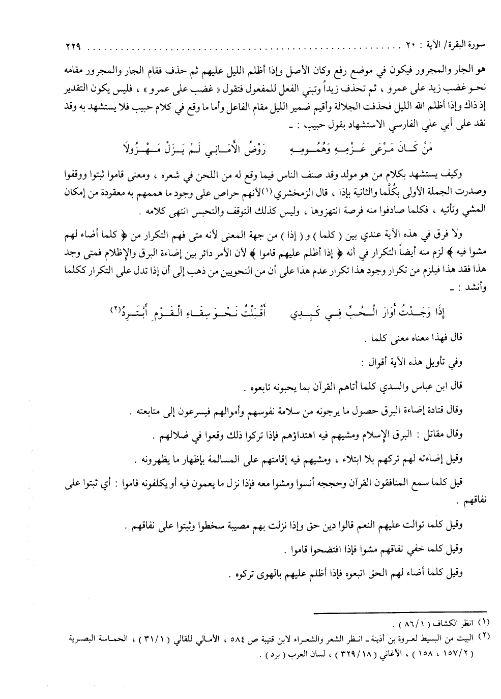 وكيف يستشهد بكلام من هو مولد ، وقد صنف الناس فيما وقع له من اللحن في شعره ؟ ومعنى قاموا : ثبتوا ووقفوا ، وصدرت الجملة الأولى بكلما ، والثانية بإذا . قال الزمخشري : لأنهم حراص على وجود ما هممهم به معقودة من إمكان المشي وتأتيه ، فكلما صادفوا منه فرصة انتهزوها ، وليس كذلك التوقف والتحبس ، انتهى كلامه . ولا فرق في هذه الآية عندي بين كلما وإذا من جهة المعنى ، لأنه متى فهم التكرار من : ) كُلَّمَا أَضَاء لَهُم مَّشَوْاْ فِيهِ ( لزم منه أيضاً التكرار في أنه إذا أظلم عليهم قاموا ، لأن الأمر دائر بين إضاءة البرق والإظلام ، فمتى وجد هذا فقد هذا ، فيلزم من تكرار وجود هذا تكرار عدم هذا ، على أن من النحويين من ذهب إلى أن إذاً تدل على التكرار ككلما ، وأنشد : إذا وجدت أوار الحب في كبدي