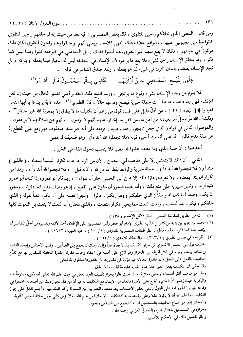 قال الطبري : هذه الآية ، يريد : ) قَدِيرٌ يَاأَيُّهَا النَّاسُ اعْبُدُواْ ( من أدلّ دليل على فساد قول من زعم أن تكليف ما لا يطاق بمعونة الله غير جائز ، وذلك أن الله عز وجل أمر بعبادته من آمن به ومن كفر بعد إخباره عنهم أنهم لا يؤمنون وأنهم عن ضلالتهم لا يرجعون .