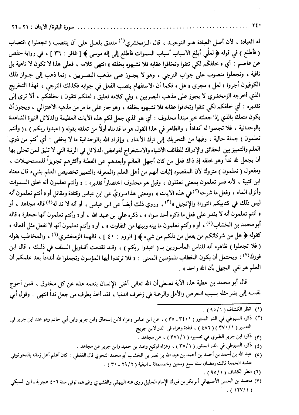 له العبادة ، لأن أصل العبادة هو التوحيد . قال الزمخشري : متعلق بلعل ، على أن ينتصب تجعلوا انتصاب فأطَّلِعَ في قوله : ) لَّعَلّى أَبْلُغُ الاْسْبَابَ أَسْبَابَ السَّمَاوَاتِ فَأَطَّلِعَ إِلَى إِلَاهِ مُوسَى ( ، في رواية حفص عن عاصم ، أي خلقكم لكي تتقوا وتخافوا عقابه فلا تشبهوه بخلقه ، انتهى كلامه . فعلى هذا لا تكون لا ناهية بل نافية ، وتجعلوا منصوب على جواب الترجي ، وهو لا يجوز على مذهب البصريين ، إنما ذهب إلى جواز ذلك الكوفيون ، أجروا لعل مجرى هل . فكما أن الاستفهام ينصب الفعل في جوابه فكذلك الترجي . فهذا التخريج الذي أخرجه الزمخشري لا يجوز على مذهب البصريين ، وفي كلامه تعليق لعلكم تتقون بخلقكم ، ألا ترى إلى تقديره أي خلقكم لكي تتقوا وتخافوا عقابه ؟ فلا تشبهوه بخلقه ، وهو جار على ما مر من مذهبه الاعتزالي ، ويجوز أن يكون متعلقاً بالذي إذا جعلته خبر مبتدأ محذوف ، أي هو الذي جعل لكم هذه الآيات العظيمة والدلائل النيرة الشاهدة بالوحدانية ، فلا تجعلوا له أنداداً . والظاهر في هذا القول هو ما قدمناه أولاً من تعلقه بقوله : ) اعْبُدُواْ رَبَّكُمُ ).
