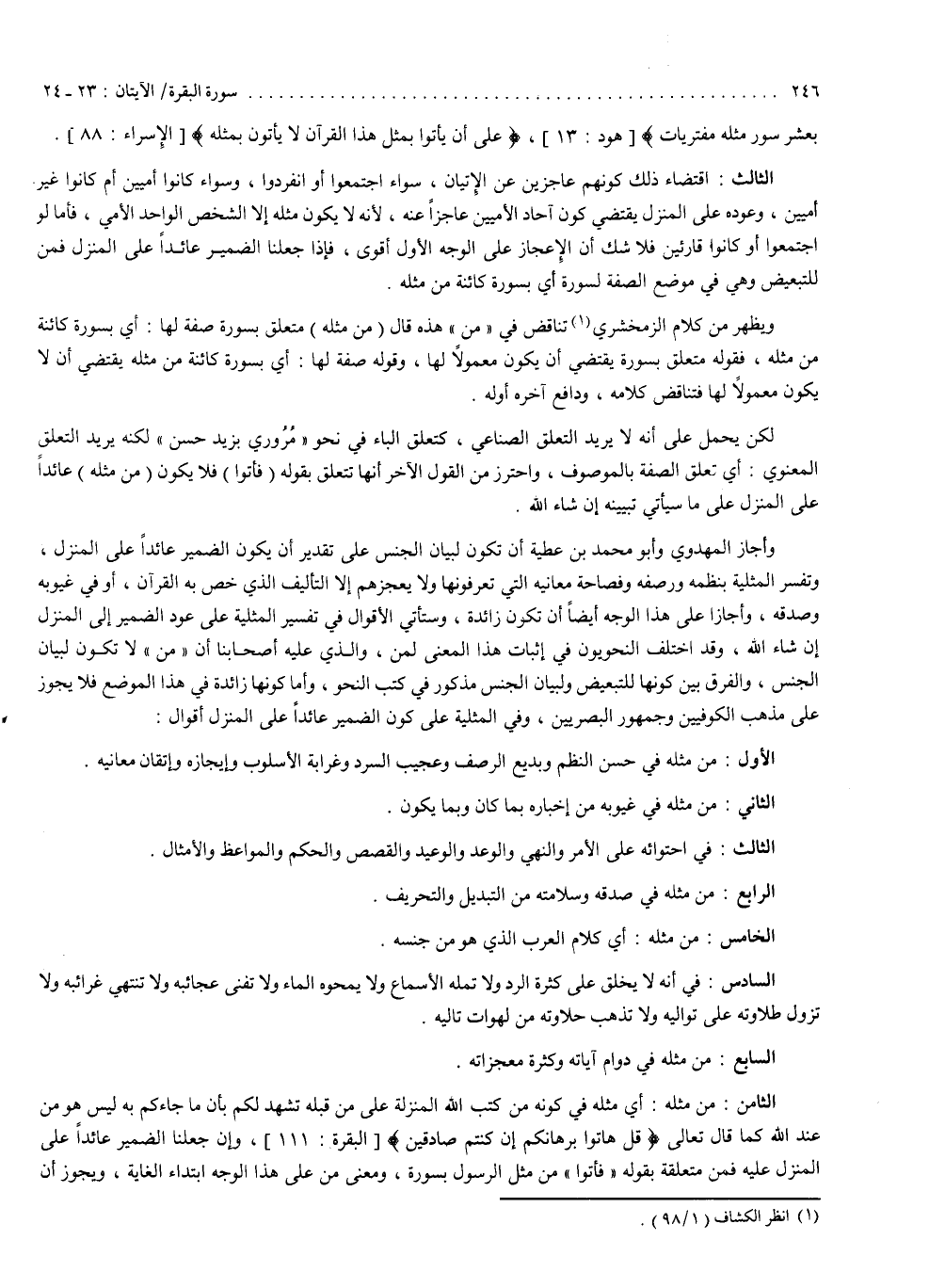 بِعَشْرِ سُوَرٍ مّثْلِهِ مُفْتَرَيَاتٍ ( ) عَلَى أَن يَأْتُواْ بِمِثْلِ هَاذَا الْقُرْءانِ لاَ يَأْتُونَ بِمِثْلِهِ ). الثالث : اقتضاء ذلك كونهم عاجزين عن الإتيان ، سواء اجتمعوا أو انفردوا ، وسواء كانوا أميين أم كانوا غير أميين ، وعوده على المنزل يقتضي كون آحاد الأدميين عاجزاً عنه ، لأنه لا يكون مثله إلا الشخص الواحد الأمي . فأما لو اجتمعوا أو كانوا قارئين فلا شك أن الإعجاز على الوجه الأول أقوى ، فإذا جعلنا الضمير عائداً على المنزل ، فمن : للتبعيض وهي في موضع الصفة لسورة أي بسورة كائنة من مثله .