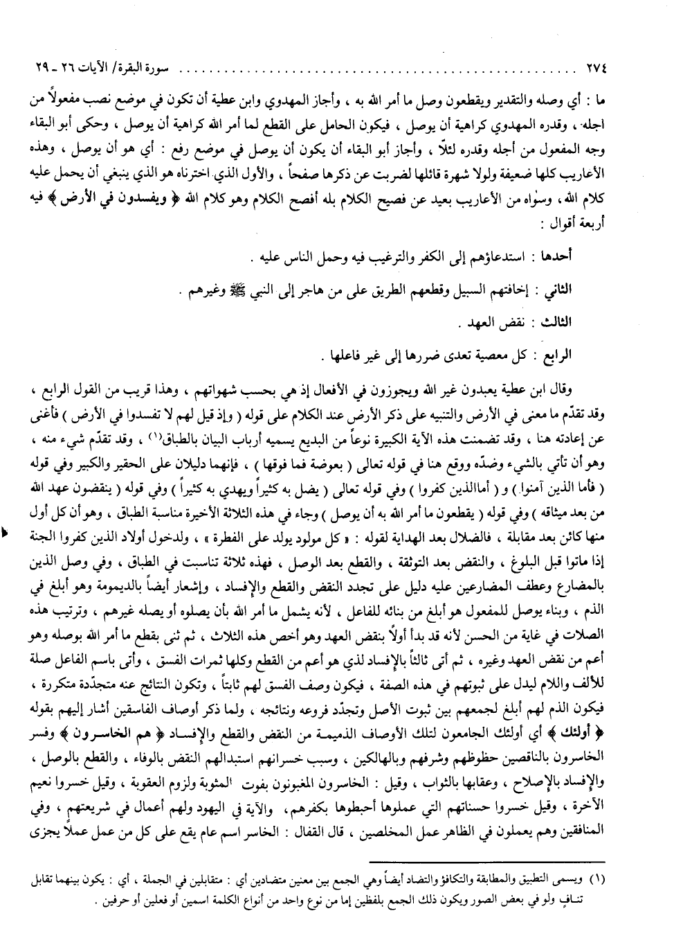 ( وَيُفْسِدُونَ فِى الاْرْضِ ( ، فيه أربعة أقوال : أحدها : استدعاؤهم إلى الكفر ، والترغيب فيه ، وحمل الناس عليه . الثاني : إخافتهم السبيل ، وقطعهم الطريق على من هاجر إلى النبي ( صلى الله عليه وسلم ) ) وغيرهم . الثالث : نقض العهد . الرابع : كل معصية تعدى ضررها إلى غير فاعلها . وقال ابن عطية : يعبدون غير الله ، ويجوزون في الأفعال ، إذ هي بحسب شهواتهم ، وهذا قريب من القول الرابع . وقد تقدّم ما معنى في الأرض ، والتنبيه على ذكر الأرض ، عند الكلام على قوله : ) وَإِذَا قِيلَ لَهُمْ لاَ تُفْسِدُواْ فِى الارْضِ ( ، فأغنى عن إعادته هنا . وقد تضمنت هذه الآية الكبيرة نوعاً من البديع يسميه أرباب البيان : بالطباق . وقد تقدّم شيء منه ، وهو أن تأتي بالشيء وضدّه ، ووقع هنا في قوله تعالى : ) بَعُوضَةً فَمَا فَوْقَهَا ( ، فإنهما دليلان على الحقير والكبير ، وفي قوله : ) فَأَمَّا الَّذِينَ ءامَنُواْ ( ، ( وَأَمَّا الَّذِينَ كَفَرُواْ ( ، وفي قوله تعالى : ) يُضِلُّ بِهِ كَثِيرًا وَيَهْدِي بِهِ كَثِيرًا وَفِى قَوْلُهُ يَنقُضُونَ عَهْدَ اللَّهِ مِن بَعْدِ مِيثَاقِهِ ( ، وفي قوله : ) ويقطعون ما أمر الله به أن يوصل . وجاء في هذه الثلاثة الأخيرة مناسبة الطباق ، وهو أن كل أول منها كائن بعد مقابله ، فالضلال بعد الهداية لقوله : كل مولود يولد على الفطرة ، ولدخول أولاد الذين كفروا الجنة إذا ماتوا قبل البلوغ ، والنقض بعد التوثقة ، والقطع بعد الوصل . فهذه ثلاثة تناسبت في الطباق . وفي وصل الذين بالمضارع وعطف المضارعين عليه دليل على تجدد النقض والقطع والإفساد ، وإشعار أيضاً بالديمومة ، وهو أبلغ في الذم ، وبناء يوصل للمفعول هو أبلغ من بنائه للفاعل ، لأنه يشمل ما أمر الله بأن يصلوه أو يصله غيرهم .