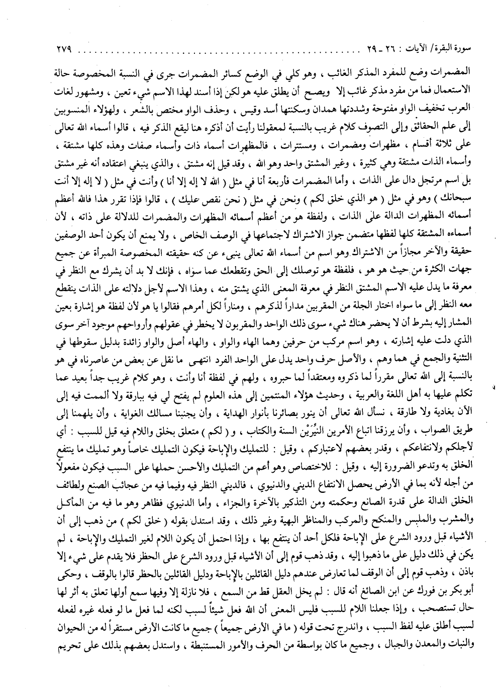 ولكم : متعلق بخلق ، واللام فيه ، قيل : للسبب ، أي لأجلكم ولانتفاعكم ، وقدر بعضهم لاعتباركم . وقيل : للتمليك والإباحة ، فيكون التمليك خاصاً ، وهو تمليك ما ينتفع الخلق به وتدعو الضرورة إليه . وقيل : للاختصاص ، وهو أعم من التمليك ، والأحسن حملها على السبب فيكون مفعولاً من أجله لأنه بما في الأرض يحصل الانتفاع الديني والدنيوي . فالديني : النظر فيه وفيما فيه من عجائب الصنع ولطائف الخلق الدالة على قدرة الصانع وحكمته ومن التذكير بالآخرة والجزاء ، وأما الدنيوي : فظاهر ، وهو ما فيه من المأكل والمشرب والملبس والمنكح والمركب والمناظر البهية وغير ذلك . وقد استدل بقوله : ) خَلَقَ لَكُمْ ( ، من ذهب إلى أن الأشياء قبل ورود الشرع على الإباحة ، فلكل أحد أن ينتفع بها ، وإذا احتمل أن يكون اللام لغير التمليك والإباحة ، لم يكن في ذلك دليل على ما ذهبوا إليه . وقد ذهب قوم إلى أن الأشياء قبل ورود الشرع على الحظر ، فلا يقدم على شيء إلا بإذن . وذهب قوم إلى أن الوقف لنا تعارض عندهم دليل القائلين بالإباحة ، ودليل القائلين بالحظر قالوا بالوقف . وحكى أبو بكر بن فورك عن ابن الصائغ أنه قال : لم يخل العقل قط من السمع ، فلا نازلة إلا وفيها سمع ، أو لها تعلق به أثر لها حال تستصحب ، وإذا جعلنا اللام للسبب ، فليس المعنى أن الله فعل شيئاً لسبب ، لكنه لما فعل ما لو فعله غيره لفعله لسبب أطلق عليه لفظ السبب واندرج تحت قوله : ) مَّا فِى الاْرْضِ جَمِيعاً ( ، جميع ما كانت الأرض مستقراً له من الحيوان والنبات والمعدن والجبال ، وجميع ما كان بواسطة من الحرف والأمور المستنبطة . واستدل بعضهم بذلك على تحريم