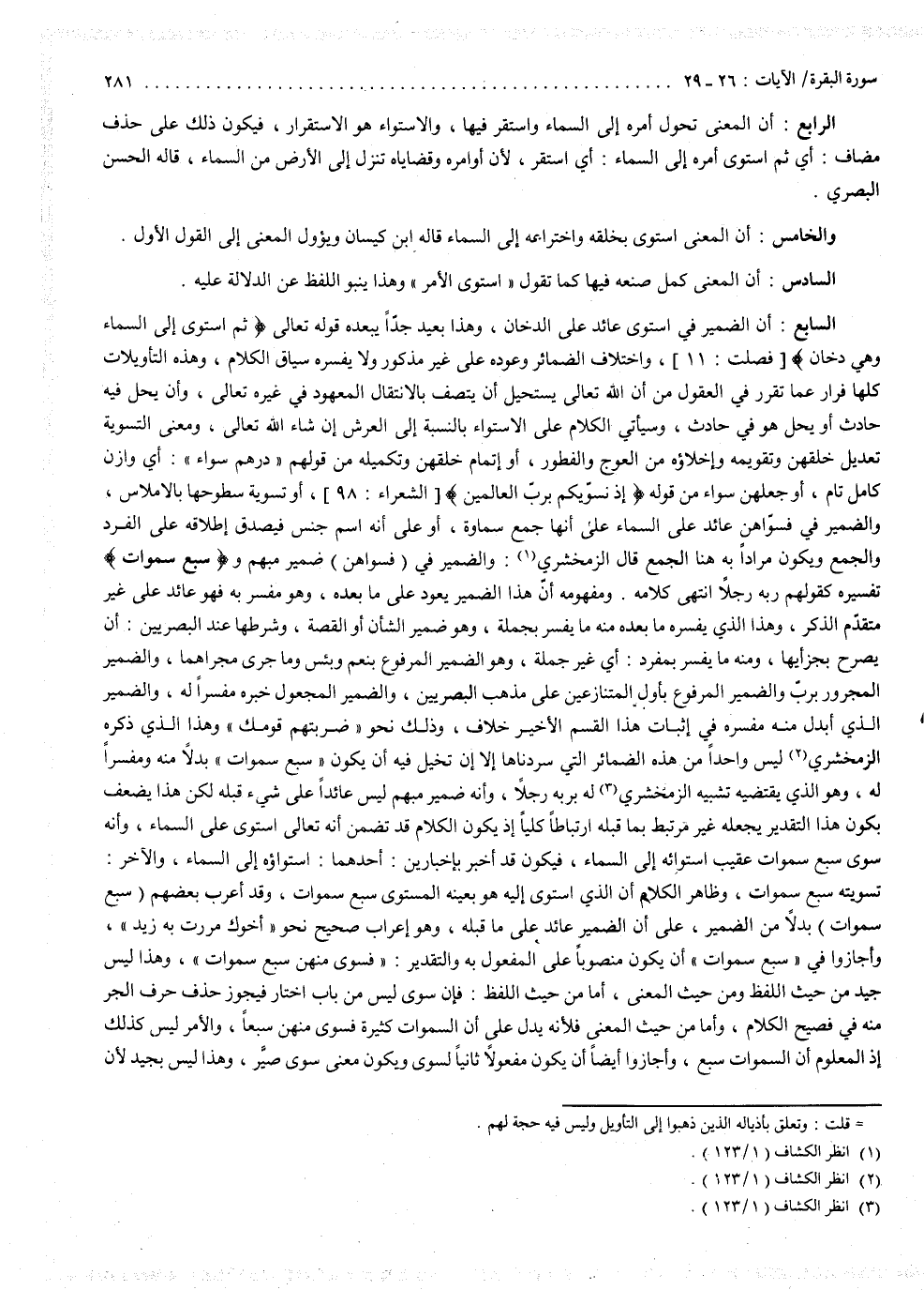 الرابع : أن المعنى تحول أمره إلى السماء واستقر فيها ، والاستواء هو الاستقرار ، فيكون ذلك على حذف مضاف ، أي ثم استوى أمره إلى السماء ، أي استقر لأن أوامره وقضاياه تنزل إلى الأرض من السماء ، قاله الحسن البصري . والخامس : أن المعنى استوى بخلقه واختراعه إلى السماء ، قاله ابن كيسان ، ويؤول المعنى إلى القول الأول . السادس : أن المعنى كمل صنعه فيها ، كما تقول : استوى الأمر ، وهذا ينبو اللفظ عن الدلالة عليه . السابع : أن الضمير في استوى عائد على الدخان ، وهذا بعيد جدًّا يبعده قوله تعالى : ) ثُمَّ اسْتَوَى إِلَى السَّمَاء وَهِىَ دُخَانٌ ( ، واختلاف الضمائر وعوده على غير مذكور ، ولا يفسره سياق الكلام .