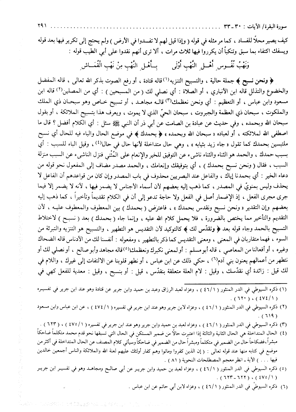 وفي حديث عن عبادة بن الصامت ، عن أبي ذر ، أن النبي ( صلى الله عليه وسلم ) ) سئل : أي الكلام أفضل قال : ( ما اصطفى الله لملائكته أو لعباده سبحان الله وبحمده ) . ) بِحَمْدِكَ ( : في موضع الحال ، والباء فيه للحال ، أي نسبح ملتبسين بحمدك ، كما تقول : جاء زيد بثبابه ، وهي حال متداخلة لأنها حال في حال . وقيل : الباء للسبب ، أي بسبب حمدك ، والحمد هو الثناء ، والثناء ناشيء عن التوفيق للخير والإنعام على المثنى ، فنزل الناشىء عن السبب منزلة السبب فقال : ونحن نسبح بحمدك ، أي بتوفيقك وإنعامك ، والحمد مصدر مضاف إلى المفعول نحو قوله : من دعاء الخير ، أي بحمدنا إياك . والفاعل عند البصريين محذوف في باب الصمدر ، وإن كان من قواعدهم أن الفاعل لا يحذف وليس ممنوع في المصدر ، كما ذهب إليه بعضهم ، لأن أسماء الأجناس لا يضمر فيها ، لأنه لا يضمر إلا فيما جرى مجرى الفعل ، إذ الإضمار أصل في الفعل ، ولا حاجة تدعو إلى أن في الكلام تقديماً وتأخيراً ، كما ذهب إليه بعضهم ، وأن التقدير : ونحن نسبح ونقدس لك بحمدك ، فاعترض بحمدك بين المعطوف والمعطوف عليه لأن التقديم والتأخير مما يختص بالضرورة ، فلا يحمل كلام الله عليه ، وإنما جاء بحمدك بعد نسبح لاختلاط التسبيح بالحمد . وجاء قوله بعد : ) وَنُقَدّسُ لَكَ ( كالتوكيد ، لأن التقديس هو : التطهير ، والتسبيح هو : التنزيه والتبرئة من السوء ، فهما متقاربان في المعنى . ومعنى التقديس كما ذكرنا التطهير ، ومفعوله أنفسنا لك من الأدناس ، قاله الضحاك وغيره ، أو أفعالنا من المعاصي ، قاله أبو مسلم ، أو المعنى : نكبرك ونعظمك . قاله مجاهد وأبو صالح ، أو نصلي لك ، أو نتطهر من أعمالهم يعنون بني آدم . حكى ذلك عن ابن عباس ، أو نطهر قلوبنا عن الالتفات إلى غيرك ، واللام في لك زائدة ، أي نقدّسك . وقيل : لام العلة متعلقة بتقدّس ، قيل : أو بنسج وقيل : معدية للفعل ، كهي في