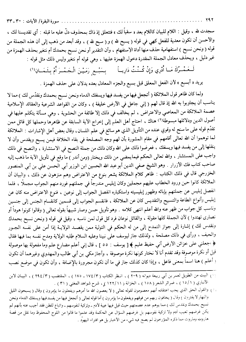 يريد : أبسبع ، لأن الفعل المعلق قبل بسبع والجزء المعادل بعده يدلان على حذف الهمزة . ولما كان ظاهر قول الملائكة : ) أَتَجْعَلُ فِيهَا مَن يُفْسِدُ فِيهَا وَيَسْفِكُ الدِّمَاء وَنَحْنُ نُسَبّحُ بِحَمْدِكَ وَنُقَدّسُ لَكَ ( ، مما لا يناسب أن يجاوبوا به الله ، إذ قال لهم : ) إِنّي جَاعِلٌ فِى الارْضِ خَلِيفَةً ). وكان من القواعد الشرعية والعقائد الإسلامية عصمة الملائكة من المعاصي والاعتراض ، لم يخالف في ذلك إلا طائفة من الحشوية . وهي مسألة يتكلم عليها في أصول الدين ، ودلائلها مبسوطة هناك ، احتاج أهل العلم إلى إخراج الآية السابقة عن ظاهرها وحملها كل قائل ممن تقدّم قوله على ما سبح له ، وقوي عنده من التأويل الذي هو سائغ في علم اللسان . وقال بعض أهل الإشارات : الملائكة لما توهموا أن الله تعالى أقامهم في مقام المشورة بأن لهم وجه المصلحة في بقاء الخلافة فيمن يسبح ويقدس ، وأن لا ينقلها إلى من يفسد فيها ويسفك ، فعرضوا ذلك على الله ، وكان ذلك من جملة النصح في الاستشارة ، والنصح في ذلك واجب على المستشار ، ولله تعالى الحكم فيما يمضي من ذلك ويختار .