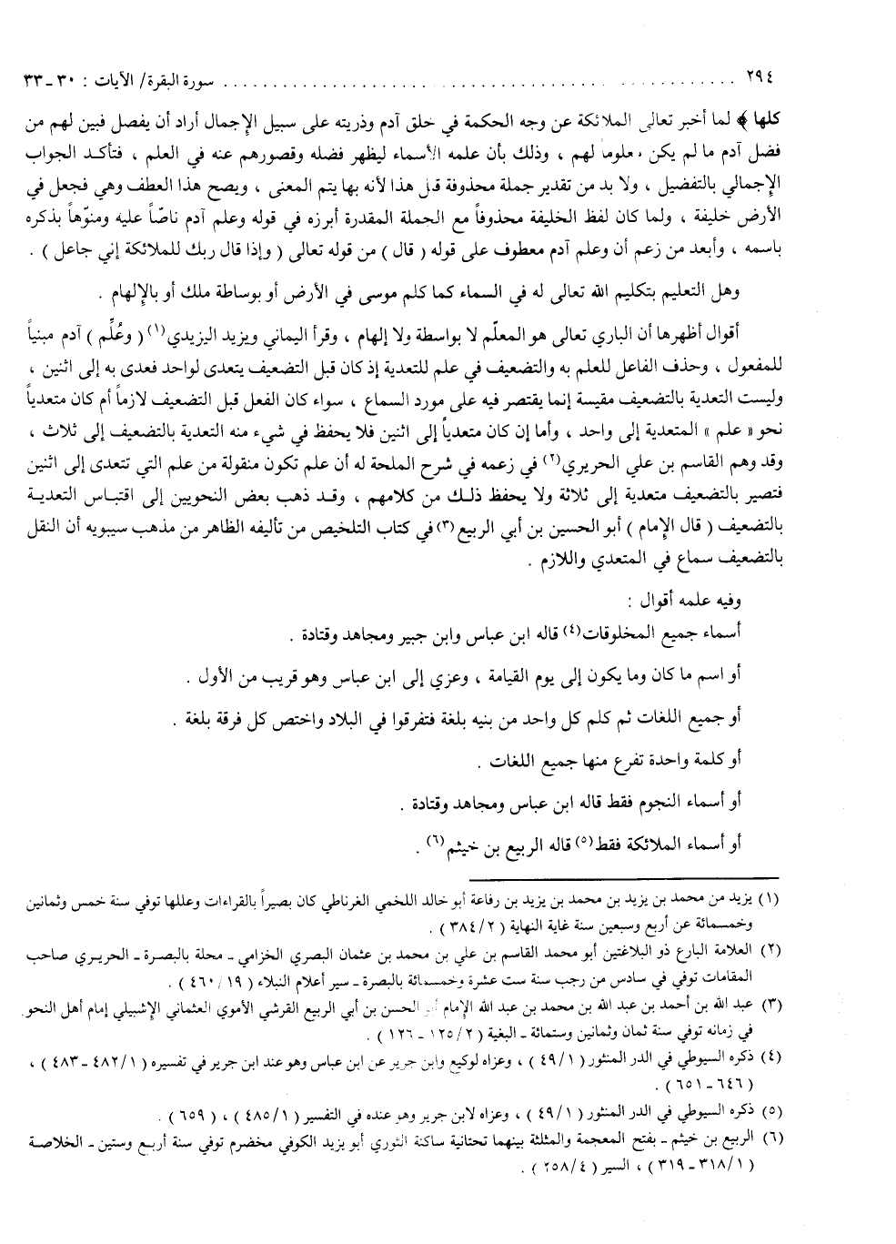 كُلَّهَا ( : لما أخبر تعالى الملائكة عن وجه الحكمة في خلق آدم وذريته على سبيل الإجمال ، أراد أن يفصل ، فبين لهم من فضل آدم ما لم يكن معلوماً لهم ، وذلك بأن علمه الأسماء ليظهر فضله وقصورهم عنه في العلم ، فتأكد الجواب الإجمالي بالتفضيل . ولا بد من تقدير جملة محذوفة قبل هذا ، لأنه بها يتم المعنى ويصح هذا العطف ، وهي : فجعل في الأرض خليفة . ولما كان لفظ الخليفة محذوفاً مع الجملة المقدرة ، أبرزه في قوله : ) وَعَلَّمَ ءادَمَ ( ، ناصاً عليه ومنوهاً بذكره باسمه . وأبعد من زعم أن : ) وَعَلَّمَ ءادَمَ ( معطوف على قوله ، قال من قوله تعالى : ) وَإِذْ قَالَ رَبُّكَ لِلْمَلَائِكَةِ إِنّي جَاعِلٌ ). وهل التعليم بتكليم الله تعالى له في السماء ، كما كلم موسى في الأرض ، أو بوساطة ملك أو بالإلهام ؟ أقوال أظهرها أن الباري تعالى هو المعلم ، لا بواسطة ولا إلهام . وقرأ اليماني ويزيد اليزيدي : وعلم آدم مبنياً للمفعول ، وحذف الفاعل للعلم به والتضعيف في علم للتعدية ، إذ كان قبل التضعيف يتعدى لواحد ، فعدى به إلى اثنين . وليست التعدية بالتضعيف مقيسة ، إنما يقتصر فيه على مورد السماع ، سواء كان الفعل قبل التضعيف لازماً أم كان متعدياً ، نحو : علم المتعدية إلى واحد . وأما إن كان متعدياً إلى اثنين ، فلا يحفظ في شيء منه التعدية بالتضعيف إلى ثلاث . وقد وهم القاسم بن علي الحريري في زعمه في شرح الملحة له أن علم تكون منقولة من علم التي تتعدى إلى اثنين فتصير بالتضعيف متعدية إلى ثلاثة ، ولا يحفظ ذلك من كلامهم .