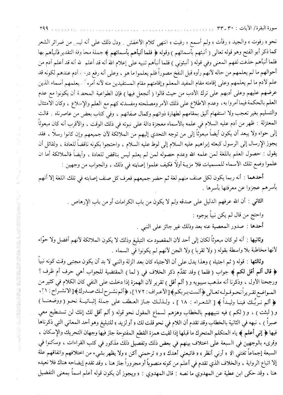 نحو : رفوت ، والجيد : رفأت ، ولم أسمع : رفيت . انتهى كلام الأخفش . ودل ذلك على أنه ليس من ضرائر الشعر ، كما ذكر أبو الفتح ، وهو قوله تعالى : ) أَنبِئْهُم بِأَسْمَائِهِمْ ). وقوله : ) فَلَمَّا أَنبَأَهُم بِأَسْمَائِهِم ( : جملة محذوفة ، التقدير : فأنبئهم بها ، فلما أنبأهم حذفت لفهم المعنى ، وفي قوله : أنبئوني ، فلما أنبأهم تنبيه على إعلام الله أنه قد أعلم الله أنه قد أعلم آدم من أحوالهم ما لم يعلمهم من حاله ، لأنهم رأوه قبل النفخ مصوراً ، فلم يعلموا ما هو ، وعلى أنه رفع درجة آدم عندهم ، لكونه قد علم لآدم ما لم يعلمهم ، وعلى إقامته مقام المفيد المعلم ، وإقامتهم مقام المستفيدين منه ، لأنه أمره أن يعلمهم أسماء الذين عرضهم عليهم وعلى أدبهم على ترك الأدب من حيث قالوا : ) أَتَجْعَلُ فِيهَا ( ، فإن الطواعية المحضة ويكونوا مع عدم العلم بالحكمة فيما أمروا به ، وعدم الاطلاع على ذلك الأمر ومصلحته ومفسدته كهم مع العلم والاطلاع . وكان الامتثال والتسليم ، بغير تعجب ولا استفهام ، أليق بمقامهم لطهارة ذواتهم وكمال صفاتهم .