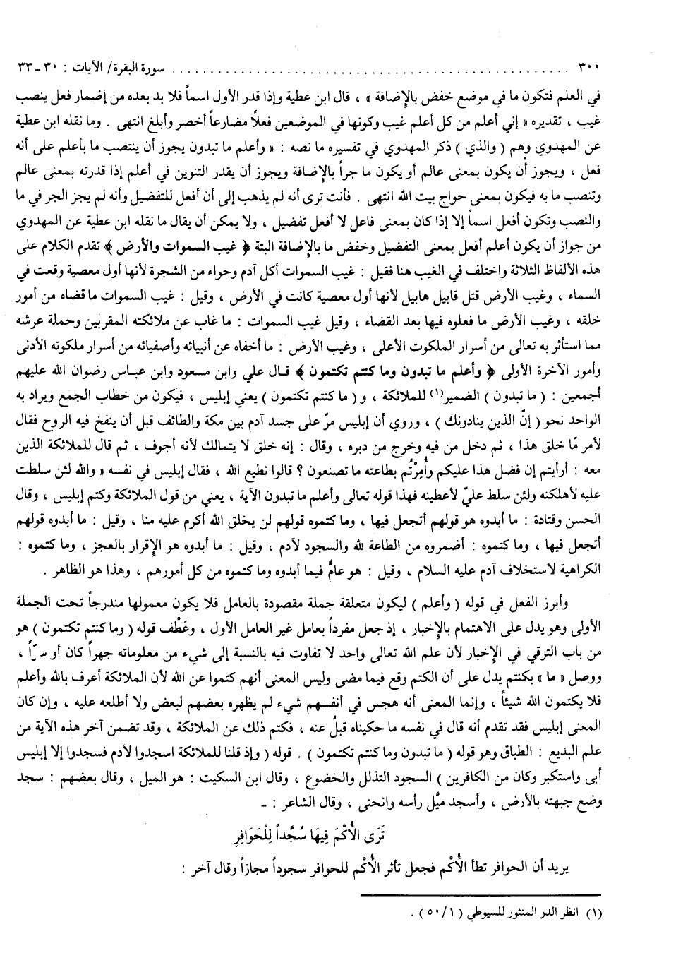 في العلم ، فتكون ما في موضع خفض بالإضافة . قال ابن عطية : وإذا قدر الأول اسماً ، فلا بد من إضمار فعل ينصب غيب ، تقديره : إني أعلم من كل أعلم غيب ، وكونها في الموضعين فعلاً مضارعاً أخصر وأبلغ . انتهى . وما نقله ابن عطية عن المهدوي وهم . والذي ذكر المهدوي في تفسيره ما نصه : ) وَأَعْلَمُ مَا تُبْدُونَ ( ، يجوز أن ينتصب ما بأعلم على أنه فعل ، ويجوز أن يكون بمعنى عالم ، أو يكون ما جراً بالإضافة ، ويجوز أن يقدر التنوين في أعلم إذا قدرته بمعنى عالم وتنصب ما به ، فيكون بمعنى حواج بيت الله ، انتهى . فأنت ترى أنه لم يذهب إلى أن أفعل للتفضيل وأنه لم يجز الجر في ما والنصب ، وتكون أفعل اسماً إلا إذا كان بمعنى فاعل لا أفعل تفضيل ، ولا يمكن أن يقال ما نقله ابن عطية عن المهدوي من جواز أن يكون أعلم أفعل بمعنى التفضيل ، وخفض ما بالإضافة ألبتة .
