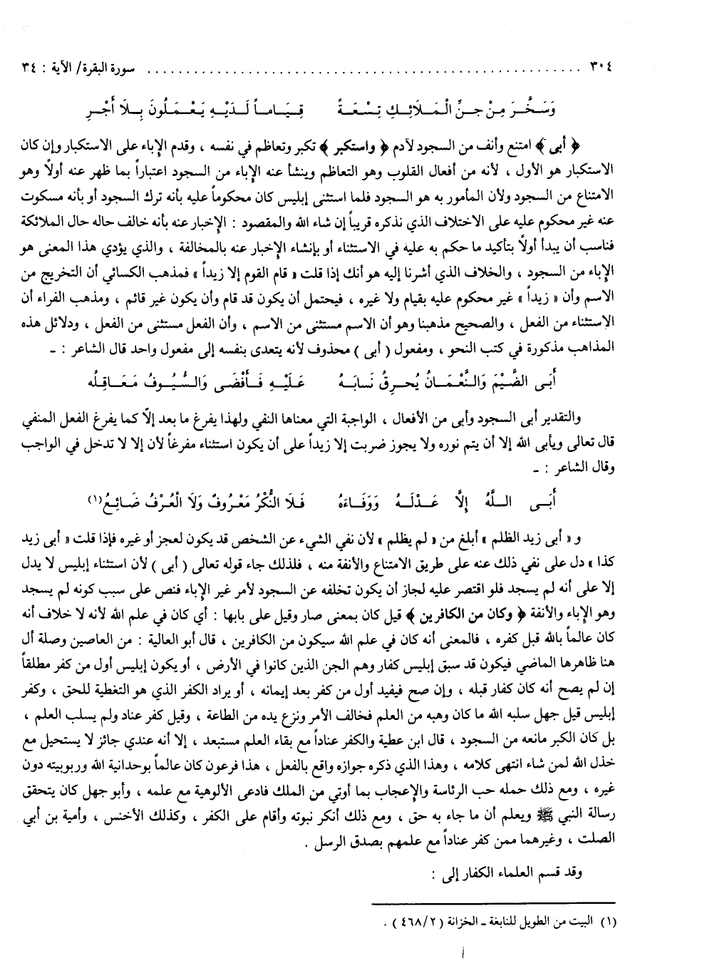 ) أَبَى ( : امتنع وأنف من السجود لآدم . ) وَاسْتَكْبَرَ ( : تكبر وتعاظم في نفسه وقدم الإباء على الاستكبار ، وإن كان الاستكبار هو الأول ، لأنه من أفعال القلوب وهو التعاظم ، وينشأ عنه الإباء من السجود اعتباراً بما ظهر عنه أولاً ، وهو الامتناع من السجود ، ولأن المأمور به هو السجود ، فلما استثنى إبليس كان محكوماً عليه بأنه ترك السجود ، أو بأنه مسكوت عنه غير محكوم عليه على الاختلاف الذي نذكره قريباً إن شاء الله . والمقصود : الإخبار عنه بأنه خالف حاله حال الملائكة . فناسب أن يبدأ أولاً بتأكيد ما حكم به عليه في الاستثناء ، أو بإنشاء الإخبار عنه بالمخالفة ، والذي يؤدي هذا المعنى هو الإباء من السجود . والخلاف الذي أشرنا إليه هو أنك إذا قلت : قام القوم إلا زيداً ، فمذهب الكسائي أن التخريج من الاسم ، وأن زيداً غير محكوم عليه أم ولا غيره ، فيحتمل أن يكون قد قام ، وأن يكون غير قائم . ومذهب الفراء أن الاستثناء من القول ، والصحيح مذهبنا ، وهو أن الاسم مستثنى من الاسم وأن الفعل مستثنى من الفعل . ودلائل هذه المذاهب مذكورة في كتب النحو ، ومفعول أبي محذوف لأنه يتعدى بنفسه إلى مفعول واحد ، قال الشاعر : أبى الضيم والنعمان يحرق نابه