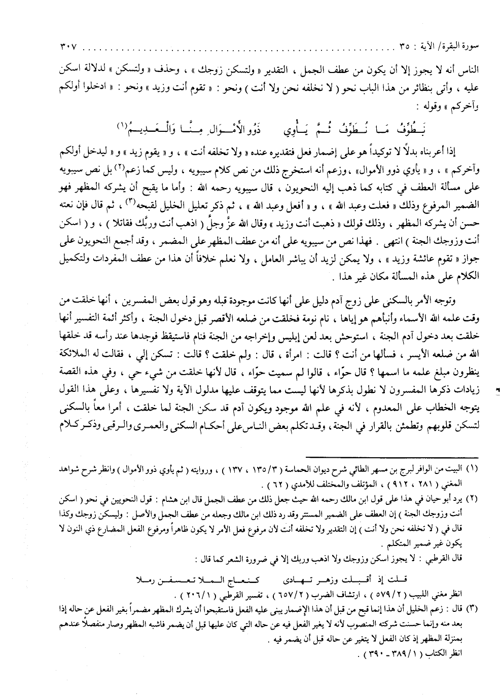 فهذا نص من سيبويه على أنه من عطف المظهر على المضمر ، وقد أجمع النحويون على جواز : تقوم عائشة وزيد ، ولا يمكن لزيد أن يباشر العامل ، ولا نعلم خلافاً أن هذا من عطف المفردات . ولتكميل الكلام على هذه المسألة مكان غير هذا ، وتوجه الأمر بالسكنى على زوج آدم دليل على أنها كانت موجودة قبله ، وهو قول بعض المفسرين أنها خلقت من وقت علمه الله الأسماء وأنبأهم هو إياها . نام نومة فخلقت من ضلعه الأقصر قبل دخول الجنة . وأكثر أئمة التفسير أنها خلقت بعد دخول آدم الجنة . استوحش بعد لعن إبليس وإخراجه من الجنة فنام ، فاستيقظ فوجدها عند رأسه قد خلقها الله من ضلعه الأيسر ، فسألها : من أنت ؟ قالت : امرأة ، قال : ولم خلقت ؟ قالت : تسكن إليّ ، فقالت له الملائكة ، ينظرون مبلغ علمه : ما اسمها ؟ قال : حوّاء . قالوا : لم سميت حوّاء ؟ قال : لأنها خلقت من شيء حي . وفي هذه القصة زيادات ذكرها المفسرون لا نطول بذكرها لأنها ليست مما يتوقف عليها مدلول الآية ولا تفسيرها .