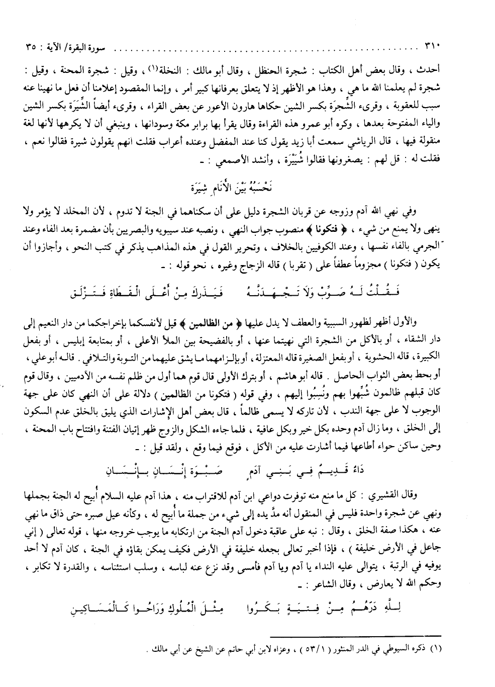 أحدث . وقال بعض أهل الكتاب : شجرة الحنظل . وقال أبو مالك : النخلة . وقيل : شجرة المحنة . وقيل : شجرة لم يعلمنا الله ما هي ، وهذا هو الأظهر ، إذ لا يتعلق بعرفانها كبير أمر ، وإنما المقصود إعلامنا أن فعل ما نهينا عنه سبب للعقوبة . وقرىء : الشجرة بكسر الشين ، حكاها هارون الأعور عن بعض القراء . وقرىء أيضاً الشيرة ، بكسر الشين والياء المفتوحة بعدها ، وكره أبو عمرو هذه القراءة وقال : يقرأ بها برابر مكة وسودانها ، وينبغي أن لا يكرهها ، لأنها لغة منقولة ، فيها قال الرياشي : سمعت أبا زيد يقول : كنا عند المفضل وعنده أعراب ، فقلت : إنهم يقولون شيرة ، فقالوا : نعم ، فقلت له : قل لهم يصغرونها ، فقالوا سبيرة ، وأنشد الأصمعي :