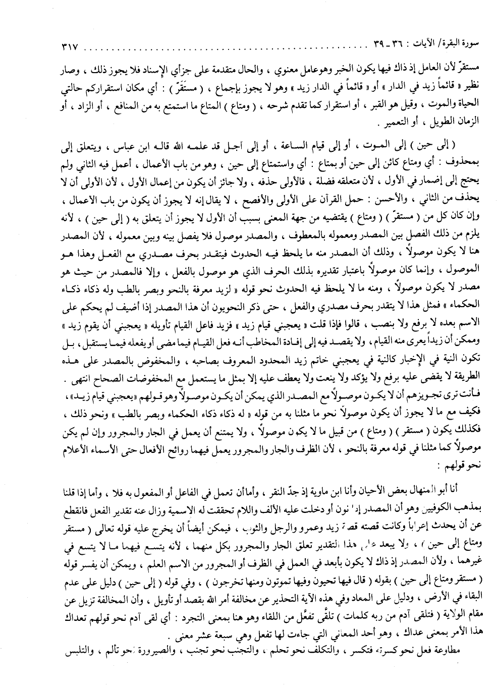فأنت ترى تجويزهم أن لا يكون موصولاً مع المصدر الذي يمكن أن يكون موصولاً ، وهو قولهم : يعجبني قيام زيد ، فكيف مع ما لا يجوز أن يكون موصولاً نحو : ما مثلنا به من قوله : له ذكاء ذكاء الحكماء ، وبصر بالطب ، ونحو ذلك ، فكذلك يكون مستقر ومتاع من قبيل ما لا يكون موصولاً . ولا يمتنع أن يعمل في الجار والمجرور ، وإن لم يكن موصولاً ، كما مثلنا في قوله : له معرفة بالنحو ، لأن الظرف والجار والمجرور يعمل فيهما روائح الأفعال ، حتى الأسماء الأعلام ، نحو قولهم : أنا أبو المنهال بعض الأحيان ، وأنا ابن ماوية إذ جدّ النقر . وأما أن تعمل في الفاعل ، أو المفعول به فلا . وأما إذا قلنا بمذهب الكوفيين ، وهو أن المصدر إذا نون ، أو دخلت عليه الألف واللام ، تحققت له الاسمية وزال عنه تقدير الفعل ، فانقطع عن أن يحدث إعراباً ، وكانت قصته قصة زيد وعمرو والرجل والثوب ، فيمكن أيضاً أن يخرج عليه قوله تعالى : ) مُسْتَقَرٌّ وَمَتَاعٌ إِلَى حِينٍ ( ، ولا يبعد على هذا التقدير تعلق الجار والمجرور بكل منهما ، لأنه يتسع فيهما ما لا يتسع في غيرهما ، ولأن المصدر إذ ذاك لا يكون بأبعد في العمل في الظرف أو المجرور من الاسم العلم . ويمكن أن يفسر قوله : ) مُّسْتَقِرٌّ مَتَاعٌ إِلَى حِينٍ ( بقوله : ) قَالَ فِيهَا تَحْيَوْنَ وَفِيهَا تَمُوتُونَ وَمِنْهَا تُخْرَجُونَ وَفِى قَوْلُهُ إِلَى حِينٍ ( دليل على عدم البقاء في الأرض ، ودليل على المعاد . وفي هذه الآية التحذير عن مخالفة أمر الله بقصد أو تأويل ، وأن المخالفة تزيل عن مقام الولاية .