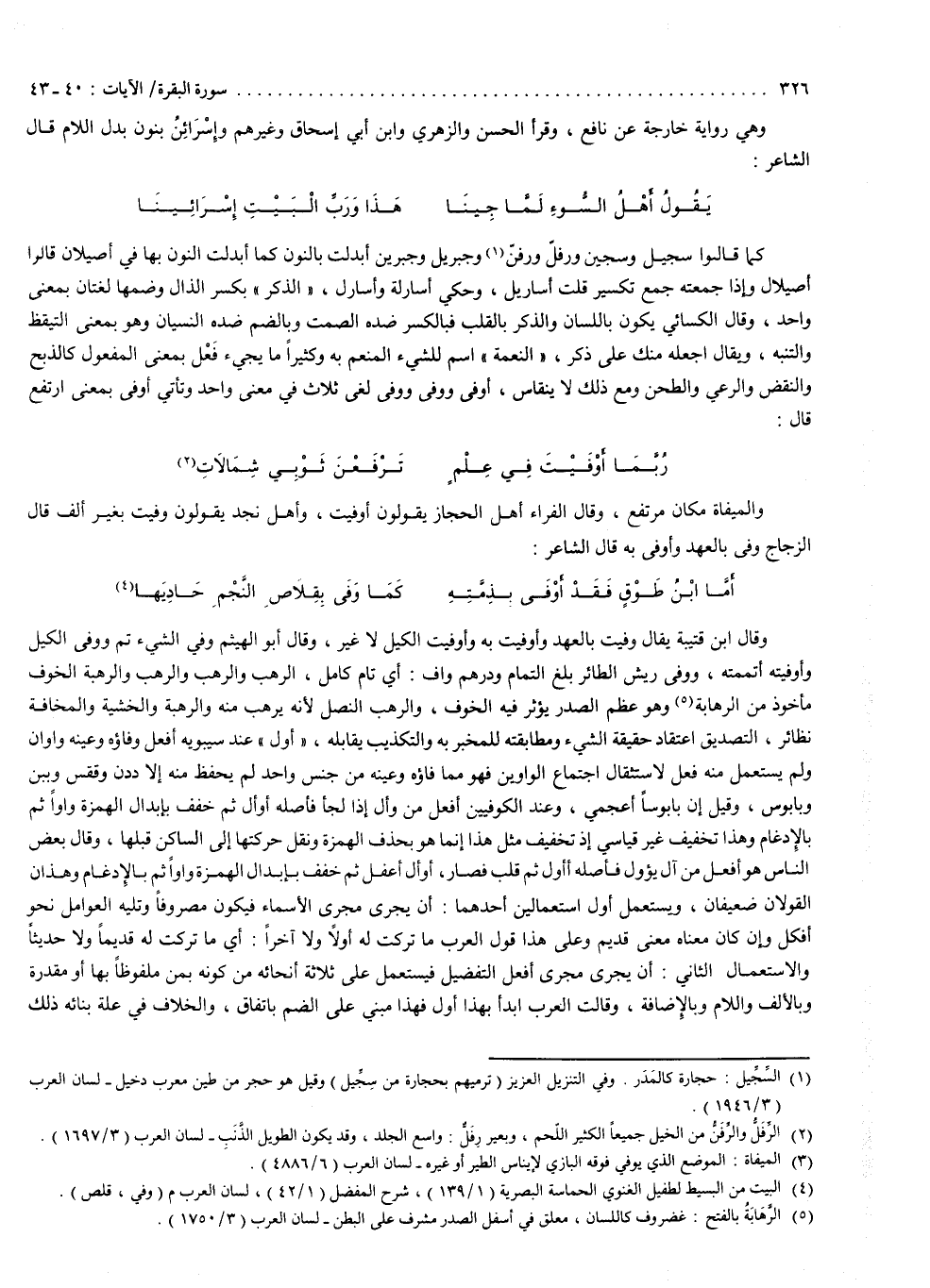 كما قالوا : سجيل ، وسجين ، ورفلّ ، ورفنّ ، وجبريل ، وجبرين ، أبدلت بالنون كما أبدلت النون بها في أصيلان قالوا : أصيلال ، وإذا جمعته جمع تكسير قلت : أساريل ، وحكي : أسارلة وأسارل . الذكر : بكسر الذال وضمها لغتان بمعنى واحد ، وقال الكسائي : يكون باللسان ، والذكر بالقلب فبالكسر ضده : الصمت ، وبالضم ضده : النسيان ، وهو بمعنى التيقظ والتنبه ، ويقال : اجعله منك على ذكر . النعمة : اسم للشيء المنعم به ، وكثيراً ما يجيء فعل بمعنى المفعول : كالذبح ، والنقص ، والرعي ، والطحن ، ومع ذلك لا ينقاس . أوفى ، ووفى ، ووفى : لغى ثلاث في معنى واحد ، وتأتي أوفى بمعنى : ارتفع ، قال : ربما أوفيت في علم