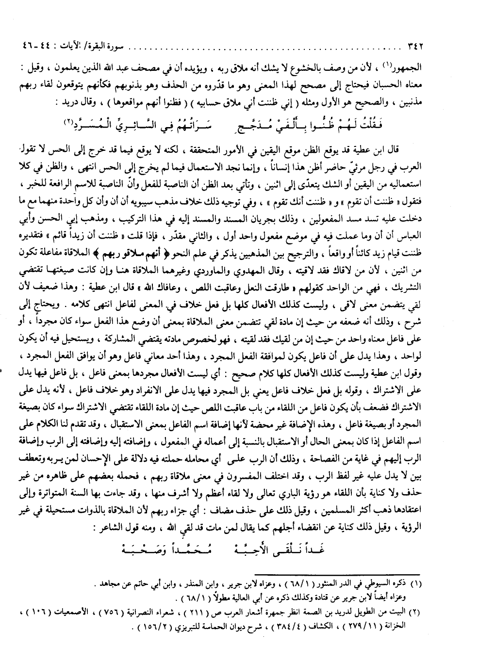 الجمهور ، لأن من وصف بالخشوع لا يشك أنه ملاق ربه ويؤيده أن في مصحف عبد الله الذين يعلمون . وقيل معناه : الحسبان ، فيحتاج إلى مصحح لهذا المعنى ، وهو ما قدّروه من الحذف ، وهو بذنوبهم فكأنهم يتوقعون لقاء ربهم مذنبين ، والصحيح هو الأول ، ومثله ) إِنّى ظَنَنتُ أَنّى مُلَاقٍ حِسَابِيَهْ ( ، فظنوا أنهم مواقعوها . وقال دريد : فقلت لهم ظنوا بألفي مدجج