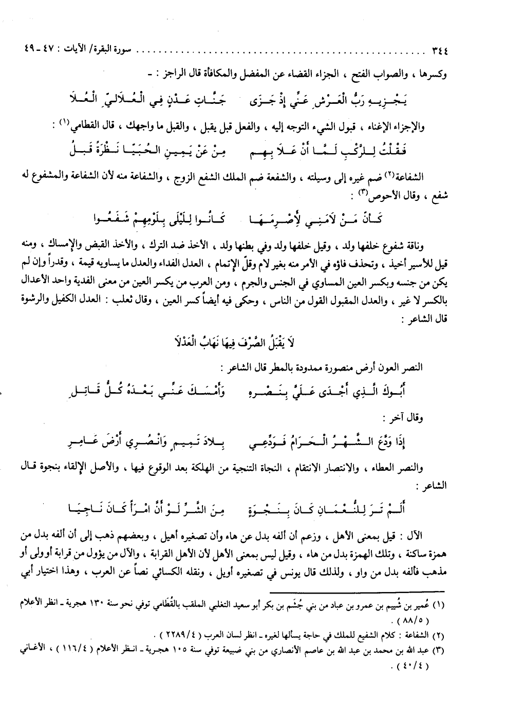وناقة شفوع : خلفها ولد . وقيل : خلفها ولد ، وفي بطنها ولد . الأخذ : ضد الترك ، والأخذ : القبض والإمساك ، ومنه قيل للأسير : أخيذ ، وتحذف فاؤه في الأمر منه بغير لام ، وقلّ الإتمام . العدل : الفداء ، والعدل : ما يساويه قيمة وقدراً ، وإن لم يكن من جنسه ، وبكسر العين : المساوي في الجنس والجرم . ومن العرب من يكسر العين من معنى الفدية ، وواحد الأعدال بالكسر لا غير ، والعدل : المقبول القول من الناس ، وحكي فيه أيضاً كسر العين . وقال ثعلب : العدل : الكفيل والرشوة ، قال الشاعر :
