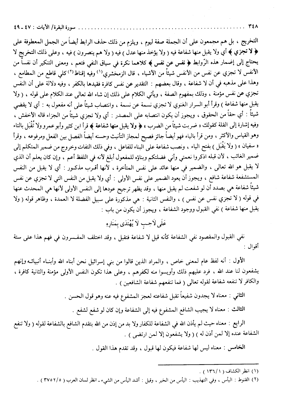 نفي القبول ، والمقصود نفي الشفاعة ، كأنه قيل : لا شفاعة ، فتقبل . وقد اختلف المفسرون في فهم هذا على ستة أقوال : الأول : أنه لفظ عام لمعنى خاص ، والمراد : الذين قالوا من بني إسرائيل نحن أبناء الله ، وأبناء أنبيائه ، وأنهم يشفعون لنا عند الله ، فرد عليهم ذلك ، وأويسوا منه لكفرهم ، وعلى هذا تكون النفس الأولى مؤمنة ، والثانية كافرة ، والكافر لا تنفعه شفاعة لقوله تعالى : ) فَمَا تَنفَعُهُمْ شَفَاعَةُ الشَّافِعِينَ ). الثاني : معناه لا يجدون شفيعاً تقبل شفاعته ، لعجز المشفوع فيه عنه ، وهو قول الحسن . الثالث : معناه لا يجيب الشافع المشفوع فيه إلى الشفاعة ، وإن كان لو شفع لشفع . الرابع : معناه حيث لم يأذن الله في الشفاعة للكفار ، ولا بد من إذن من الله بتقدم الشافع بالشفاعة لقوله : ) وَلاَ تَنفَعُ الشَّفَاعَةُ عِندَهُ إِلاَّ لِمَنْ أَذِنَ لَهُ ( ، ( وَلاَ يَشْفَعُونَ إِلاَّ لِمَنِ ارْتَضَى ). الخامس : معناه ليس لها شفاعة ، فيكون لها قبول ، وقد تقدم هذا القول .