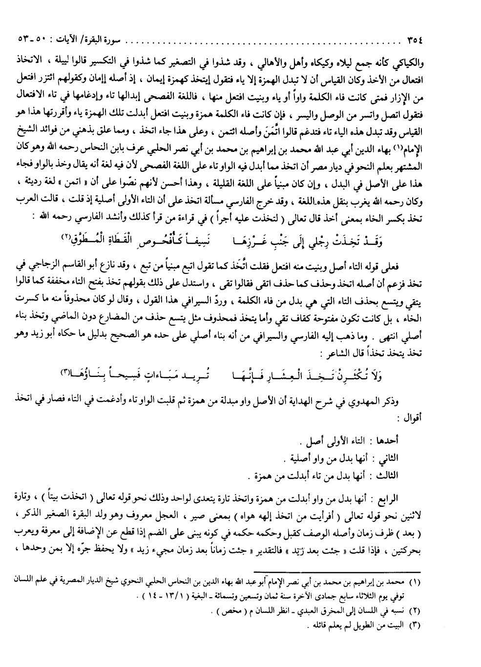والكياكي ، كأنه جمع ليلاه وكيكاه ، وأهل والأهالي . وقد شذوا في التصغير كما شذوا في التكسير ، قالوا : لييله . الاتخاذ : افتعال من الأخذ ، وكان القياس أن لا تبدل الهمزة إلا ياء ، فتقول : إيتخذ كهمزة إيمان إذ أصله : إإمان ، وكقولهم : ائتزر : افتعل من الإزار ، فمتى كانت فاء الكلمة واواً أو ياء ، وبنيت افتعل منها ، فاللغة الفصحى إبدالها تاء وإدغامها في تاء الافتعال ، فتقول : اتصل واتسر من الوصل واليسر ، فإن كانت فاء الكلمة همزة ، وبنيت افتعل ، أبدلت تلك الهمزة ياء وأقررتها . هذا هو القياس ، وقد تبدل هذه الياء تاء فتدغم ، قالوا : اتمن ، وأصله : ائتمن . وعلى هذا جاء : اتخذ . ومما علق بذهني من فوائد الشيخ الإمام بهاء الدين أبي عبد الله محمد بن إبراهيم بن محمد بن أبي نصر الحلبي ، عرف بابن النحاس ، رحمه الله ، وهو كان المشتهر بعلم النحو في ديار مصر : أن اتخذ مما أبدل فيه الواو تاء على اللغة الفصحى ، لأن فيه لغة أنه يقال : وخذ بالواو ، فجاء هذا على الأصل في البدل ، وإن كان مبنياً على اللغة القليلة ، وهذا أحسن ، لأنهم نصوا على أن اتمن لغة رديئة ، وكان رحمه الله يغرب بنقل هذه اللغة . وقد خرج الفارسي مسألة اتخذ على أن التاء الأولى أصلية ، إذ قلت : قالت العرب تخذ بكسر الخاء ، بمعنى : أخذ ، قال : تعالى : ) لاَتَّخَذْتَ عَلَيْهِ أَجْراً ( ، في قراء من قرأ كذلك ، وأنشد الفارسي ، رحمه الله : وقد تخذت رجلي إلى جنب غرزها