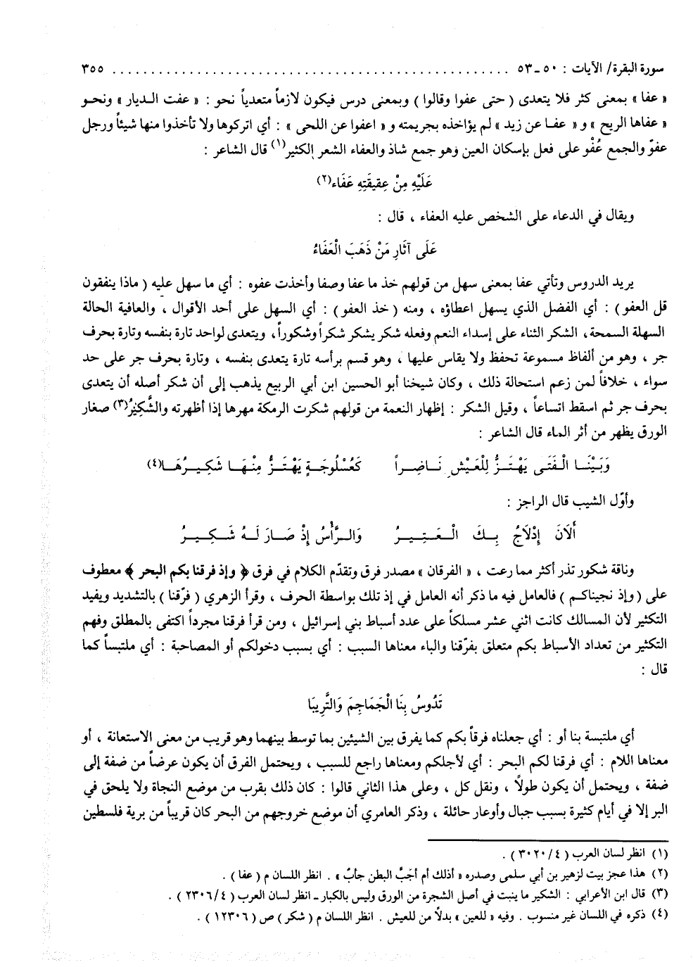 يريد الدروس ، وتأتي عفا : بمعنى سهل من قولهم : خذ ما عفا وصفا ، وأخذت عفوه : أي ما سهل عليه ، ( مَاذَا يُنفِقُونَ قُلِ الْعَفْوَ ( : أي الفضل الذي يسهل إعطاؤه ، ومنه : خذ العفو ، أي السهل على أحد الأقوال ، والعافية : الحالة السهلة السمحة . الشكر : الثناء على إسداء النعم ، وفعلة : شكر يشكرشكراً وشكوراً ، ويتعدى لواحد تارة بنفسه وتارة بحرف جر ، وهو من ألفاظ مسموعة تحفظ ولا يقاس عليها ، وهو قسم برأسه ، تارة يتعدى بنفسه وتارة بحرف جر على حد سواء ، خلافاً لمن زعم استحالة ذلك . وكان شيخنا أبو الحسين بن أبي الربيع يذهب إلى أن شكر أصله أن يتعدى بحرف جر ، ثم أسقط اتساعاً . وقيل : الشكر : إظهار النعمة من قولهم : شكرت الرمكة مهرها إذا أظهرته ، والشكير : صغار الورق يظهر من أثر الماء ، قال الشاعر : وبينا الفتى يهتز للعيش ناضرا