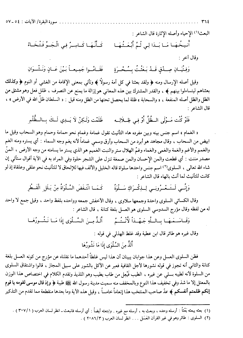فظن السلوى العسل . وعن هذا جوابان يبينان أن هذا ليس غلطاً : أحدهما : ما نقلناه عن مؤرج من كونه العسل بلغة كنانة ، والثاني : أنه تجوز في قوله : نشورها لأجل القافية ، فعبر عن الأكل بالشور ، على سبيل المجاز ، قالوا : واشتقاق السلوى من السلوة ، لأنه لطيبه يسلي عن غيره . الطيب : فيعل من طاب يطيب ، وهو اللذيذ ، وتقدم الكلام في اختصاص هذا الوزن بالمعتل ، إلا ما شذ ، وفي تخفيف هذا النوع وبالمخفف منه سميت مدينة رسول الله ( صلى الله عليه وسلم ) ) طيبة .