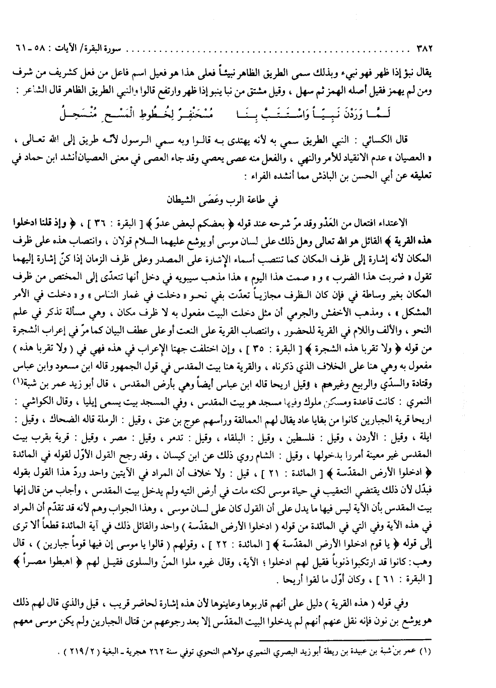 ) وَإِذْ قُلْنَا ادْخُلُواْ هَاذِهِ الْقَرْيَةَ ). القائل : هو الله تعالى ، وهل ذلك على لسان موسى أو يوشع عليهما السلام ، قولان : وانتصاب هذه على ظرف المكان ، لأنه إشارة إلى ظرف المكان ، كما تنتصب أسماء الإشارة على المصدر ، وعلى ظرف الزمان إذا كنّ إشارة إليهما تقول : ضربت هذا الضرب ، وصمت هذا اليوم . هذا مذهب سيبويه في دخل ، إنها تتعدّى إلى المختص من ظرف المكان بغير وساطة في ، فإن كان الظرف مجازياً تعدّت بفي ، نحو : دخلت في غمار الناس ، ودخلت في الأمر المشكل . ومذهب الأخفش والجرمي أن مثل : دخلت البيت ، مفعول به لا ظرف مكان ، وهي مسألة تذكر في علم النحو . والألف واللام في القرية للحضور ، وانتصاب القرية على النعت ، أو على عطف البيان ، كما مرّ في إعراب الشجرة من قوله : ) وَلاَ تَقْرَبَا هَاذِهِ الشَّجَرَةَ ( ، وإن اختلفت جهتا الإعراب في هذه ، فهي في : ) وَلاَ تَقْرَبَا هَاذِهِ ( مفعول به ، وهي هنا على الخلاف الذي ذكرناه .