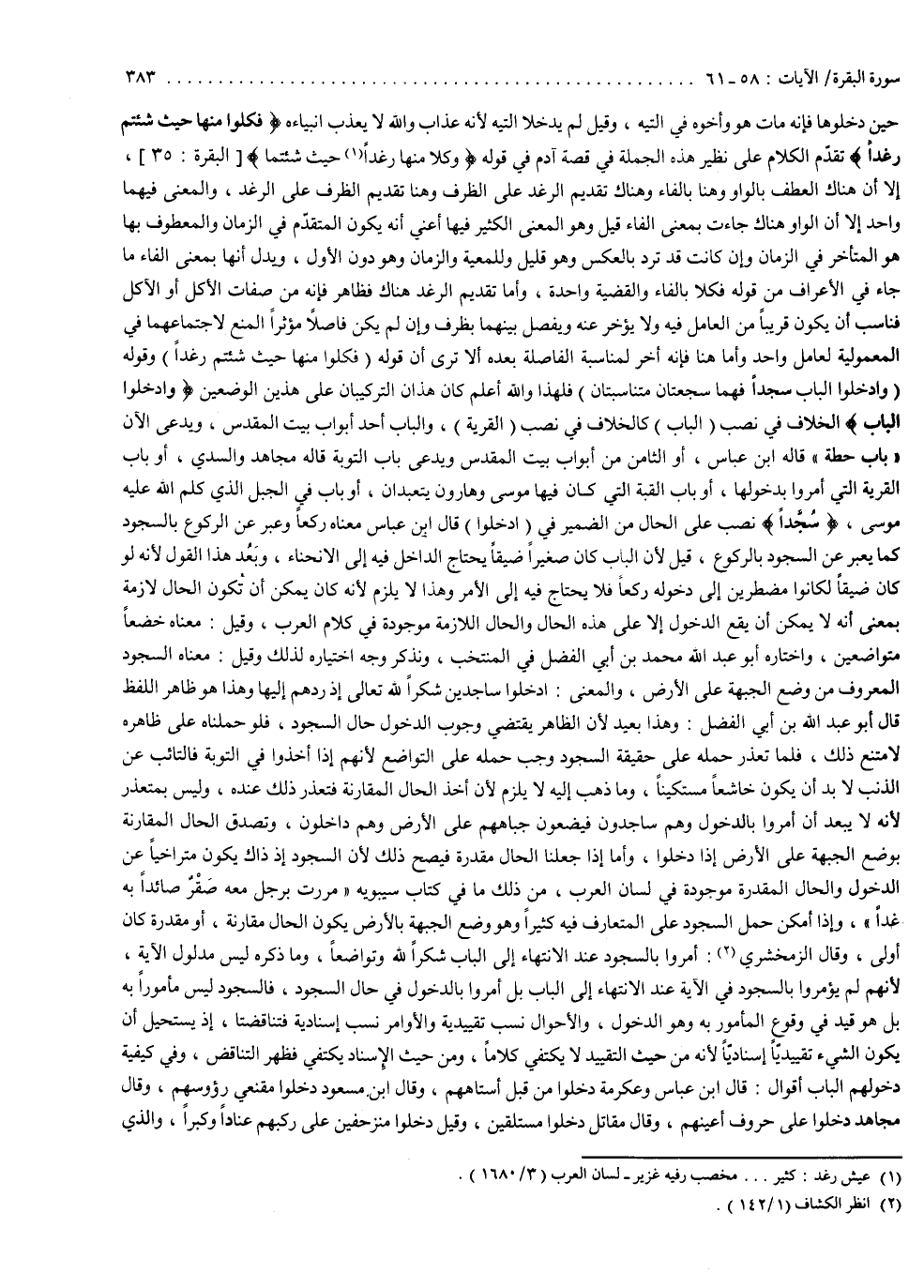 ( وَادْخُلُواْ الْبَابَ ( : الخلاف في نصب الباب كالخلاف في نصب القرية ، والباب أحد أبواب بيت المقدس ، ويدعى الآن : باب حطة ، قاله ابن عباس ؛ أو الثامن ، من أبواب بيت المقدس ، ويدعى باب التوبة ، قاله مجاهد والسدي ؛ أو باب القرية التي أمروا بدخولها ، أو باب القبة التي كان فيها موسى وهارون يتعبدان ، أو باب في الجبل الذي كلم الله عليه موسى . ) سُجَّدًا ( نصب على الحال من الضمير في ادخلوا ، قال ابن عباس : معناه ركعاً ، وعبر عن الركوع بالسجود ، كما يعبر عن السجود بالركوع ، قيل : لأن الباب كان صغيراً ضيقاً يحتاج الداخل فيه إلى الانحناء ، وبعد هذا القول لأنه لو كان ضيفاً لكانوا مضطرين إلى دخوله ركعاً ، فلا يحتاج فيه إلى الأمر ، وهذا لا يلزم ، لأنه كان يمكن أن تكون الحال لازمة بمعنى أنه لا يمكن أن يقع الدخول إلا على هذه الحال ، والحال اللازمة موجودة في كلام العرب . وقيل : معناه خضعاً متواضعين ، واختاره أبو عبد الله محمد بن أبي الفضل في المنتخب ، ونذكر وجه اختياره لذلك . وقيل : معناه السجود المعروف من وضع الجبهة على الأرض ، والمعنى : ادخلوا ساجدين شكراً لله تعالى ، إذ ردهم إليها . وهذا هو ظاهر اللفظ . قال أبو عبد الله بن أبي الفضل : وهذا بعيد ، لأن الظاهر يقتضي وجوب الدخول حال السجود ، فلو حملناه على ظاهره لامتنع ذلك ، فلما تعذر على حقيقة السجود وجب حمله على التواضع ، لأنهم إذا أخذوا في التوبة ، فالتائب عن الذنب لا بد أن يكون خاشعاً مستكيناً ، وما ذهب إليه لا يلزم ، لأن أخذ الحال مقارنة ، فتعذر ذلك عنده ، وليس بمتعذر لأنه لا يبعد أن أمروا بالدخول وهم ساجدون ، فيضعون جباههم على الأرض وهم داخلون . وتصدق الحال المقارنة بوضع الجبهة على الأرض إذا دخلوا . وأما إذا جعلنا الحال مقدرة فيصح ذلك ، لأن السجود إذ ذاك يكون متراخياً عن الدخول ، والحال المقدرة موجودة في لسان العرب . من ذلك ما في كتاب سيبويه مررت برجل معه صقر صائداً به غداً . وإذا أمكن حمل السجود على المتعارف فيه كثيراً ، وهو وضع الجبهة بالأرض يكون الحال مقارنة أو مقدرة ، كان أولى . وقال الزمخشري : أمروا بالسجود عند الانتهاء إلى الباب ، شكراً لله وتواضعاً ، وما ذكره ليس مدلول الآية لأنهم لم يؤمروا بالسجود في الآية عند الانتهاء إلى الباب ، بل أمروا بالدخول في حال السجود . فالسجود ليس مأموراً به ، بل هو قيد في وقوع المأمور به ، وهو الدخول ، والأحوال نسب تقييدية ، والأوامر نسب إسنادية ، فتناقضتا ، إذ يستحيل أن يكون الشيء تقييدياً إسنادياً ، لأنه من حيث التقييد لا يكتفي كلاماً ومن حيث الإسناد يكتفي ، فظهر التناقض . وفي كيفية دخولهم الباب أقوال : قال ابن عباس وعكرمة : دخلوا من قبل أستاههم ، وقال ابن مسعود : دخلوا مقنعي رؤوسهم ، وقال مجاهد : دخلوا على حروف أعينهم ، وقال مقاتل : دخلوا مستلقين ، وقيل : دخلوا منزحفين على ركبهم عناداً وكبراً ، والذي