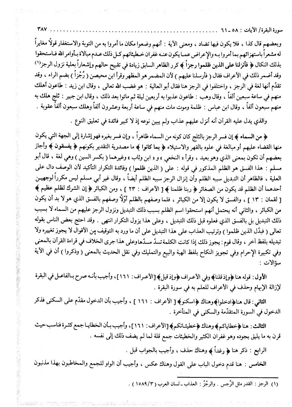 وقد احتج بعض الناس بقوله تعالى : ) فَبَدَّلَ الَّذِينَ ظَلَمُواْ ( ، وترتيب العذاب على هذا التبديل على أن ما ورد به التوقيف من الأقوال لا يجوز تغييره ولا تبديله بلفظ آخر . وقال قوم : يجوز ذلك إذا كانت الكلمة تسدّ مسدّها ، وعلى هذا جرى الخلاف في قراءة القرآن بالمعنى ، وفي تكبيرة الإحرام ، وفي تجويز النكاح بلفظ الهبة والبيع والتمليك ، وفي نقل الحديث بالمعنى . وذكروا أن في الآية سؤالات : الأول : قوله هنا ، ( وَإِذَا قُلْنَا ( ، وفي الأعراف : ) وَإِذْ قِيلَ ). وأجيب بأنه صرح بالفاعل في البقرة لإزالة الإبهام ، وحذف في الأعراف للعلم به في سورة البقرة . الثاني : قال هنا : ادخلوا ، وهناك اسكنوا . وأجيب بأن الدخول مقدّم على السكنى ، فذكر الدخول في السورة المتقدّمة . والسكنى في المتأخرة . الثالث : هنا خطاياكم ، وهناك : خطيئتاكم . وأجيب بأن الخطايا جمع كثرة ، فناسب حيث قرن به ما يليق بجوده ، وهو غفران الكثير . والخطيئات جمع قلة لما لم يضف ذلك إلى نفسه . الرابع : ذكر هنا : رغداً وهناك : حذف . وأجيب بالجواب قبل . الخامس : هنا قدم دخول الباب على القول ، وهناك عكس . وأجيب بأن الواو للجمع والمخاطبون بهذا مذنبون .