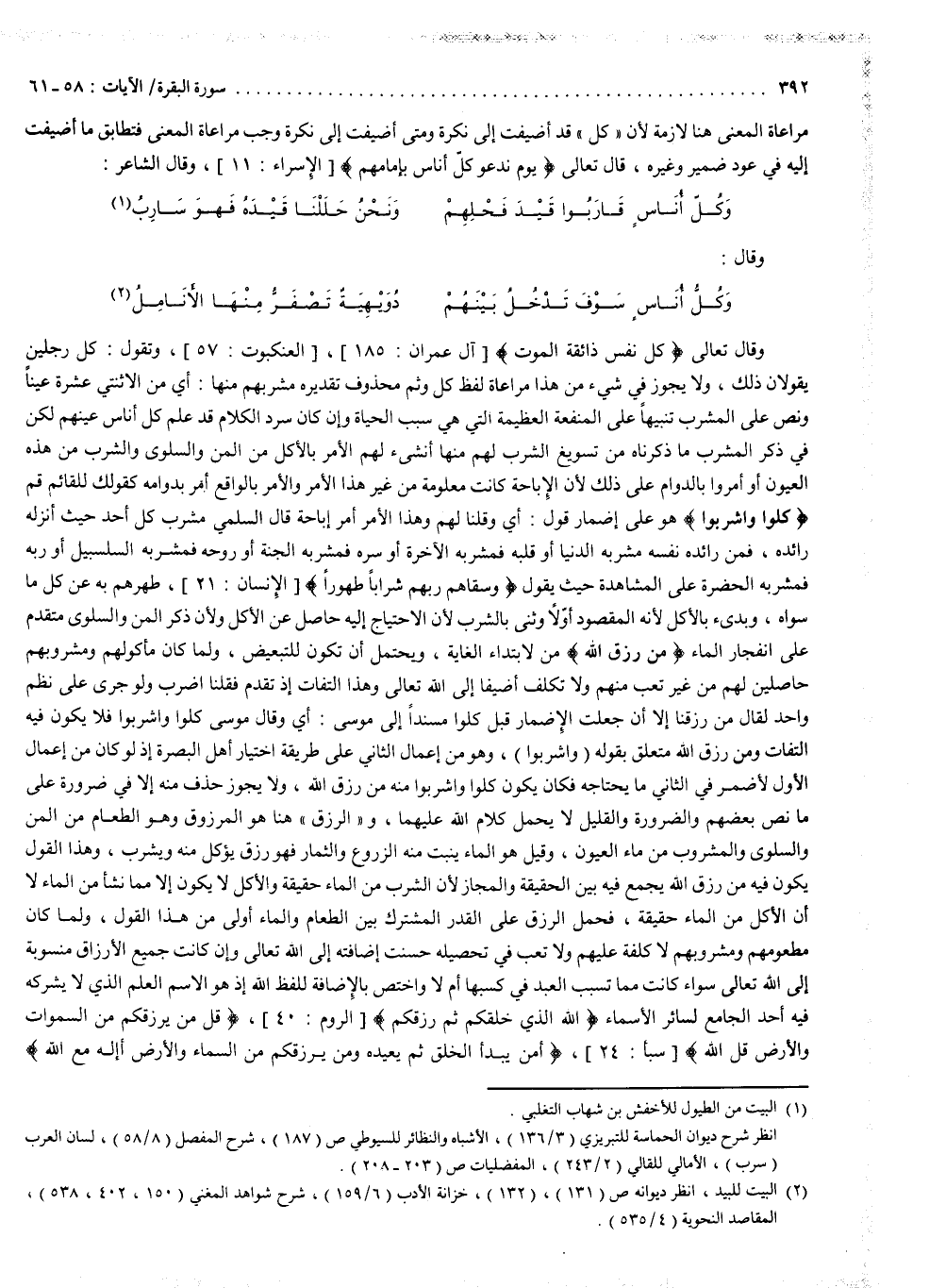 وقال تعالى : ) كُلُّ نَفْسٍ ذَائِقَةُ الْمَوْتِ ( ، وتقول : كل رجلين يقولان ذلك ، ولا يجوز في شيء من هذا مراعاة لفظ كل ، وثم محذوف تقديره : مشربهم منها : أي من الاثنتي عشرة عيناً . ونص على المشرب تنبيهاً على المنفعة العظيمة التي هي سبب الحياة ، وإن كان سرد الكلام قد علم كل أناس عينهم ، لكن في ذكر المشرب ما ذكرناه من تسويغ الشرب لهم منها أنشىء لهم الأمر بالأكل من المن والسلوى ، والشرب من هذه العيون ، أو أمروا بالدوام على ذلك ، لأن الإباحة كانت معلومة من غير هذا الأمر ، والأمر بالواقع أمر بدوامه ، كقولك للقائم : قم . ) كُلُواْ وَاشْرَبُواْ ( : هو على إضمار قول ، أي وقلنا لهم ، وهذا الأمر أمر إباحة . قال السلمي : مشرب كل أحد حيث أنزله رائده ، فمن رائده نفسه مشربه الدنيا ، أو قلبه فمشربه الآخرة ، أو سره فمشربه الجنة ، أو روحه فمشربه السلسبييل ، أو ربه فمشربه الحضرة على المشاهدة حيث يقول : ) وَسَقَاهُمْ رَبُّهُمْ شَرَاباً طَهُوراً ( ، طهرهم به عن كل ما سواه ، وبدىء بالأكل لأنه المقصود أولاً ، وثنى بالشرب لأن الاحتياج إليه حاصل عن الأكل ، ولأن ذكر المن والسلوى متقدم على انفجار الماء .