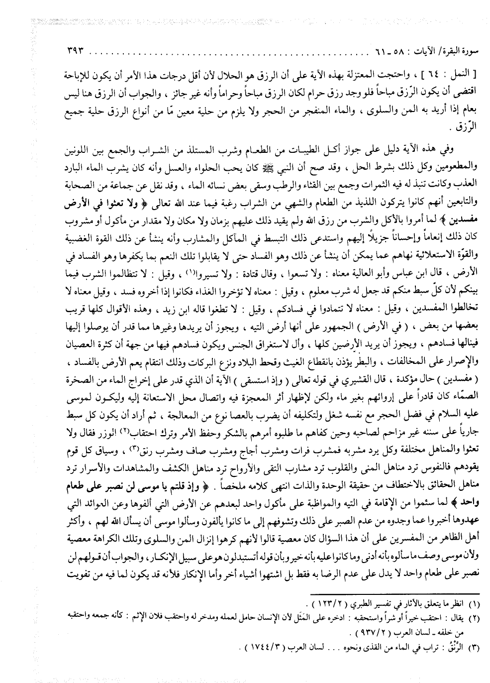 ( وَإِذْ قُلْتُمْ يَامُوسَى مُوسَى لَن نَّصْبِرَ عَلَى طَعَامٍ واحِدٍ ( : لما سئموا من الإقامة في التيه ، والمواظبة على مأكول واحد ، لبعدهم عن الأرض التي ألفوها ، وعن العوائد التي عهدوها ، أخبروا عما وجدوه من عدم الصبر على ذلك وتشوفهم إلى ما كانوا يألفون ، وسألوا موسى أن يسأل الله لهم . وأكثر أهل الظاهر من المفسرين على أن هذا السؤال كان معصية ، قالوا : لأنهم كرهوا إنزال المن والسلوى ، وتلك الكراهة معصية ، ولأن موسى وصف ما سألوه بأنه أدنى وما كانوا عليه بأنه خير ، وبأن قوله : ) أَتَسْتَبْدِلُونَ ( هو على سبيل الإنكار . والجواب ، أن قولهم : ) لَن نَّصْبِرَ عَلَى طَعَامٍ واحِدٍ ( لا يدل على عدم الرضا به فقط ، بل اشتهوا أشياء أخر . وأما الإنكار فلأنه قد يكون لما فيه من تفويت