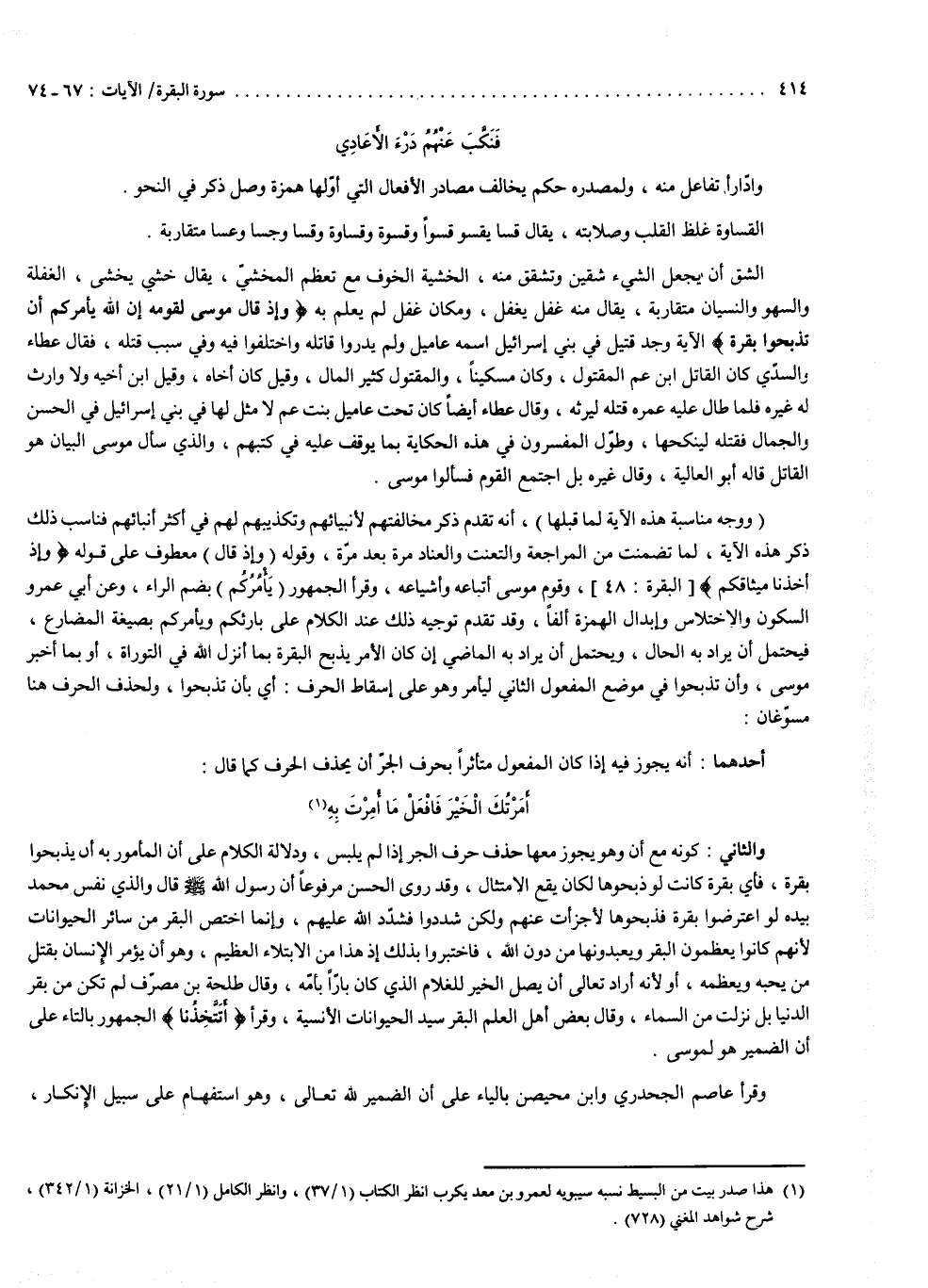 والثاني : كونه مع إن ، وهو يجوز معها حذف حرف الجر إذا لم يلبس . ودلالة الكلام على أن المأمور به أن تذبحوا بقرة ، فأي بقرة كانت لو ذبحوها لكان يقع الامتثال . وقد روى الحسن مرفوعاً ، إن رسول الله ( صلى الله عليه وسلم ) ) قال : ( والذي نفس محمد بيده لو اعترضوا بقرة فذبحوها لأجزأت عنهم ، ولكن شددوا فشدّد الله عليهم ) . وإنما اختص البقر من سائر الحيوانات لأنهم كانوا يعظمون البقر ويعبدونها من دون الله ، فاختبروا بذلك ، إذ هذا من الابتلاء العظيم ، وهو أن يؤمر الإنسان بقتل من يحبه ويعظمه ، أو لأنه أراد تعالى أن يصل الخير للغلام الذي كان بارًّا بأمّه . وقال طلحة بن مصرّف : لم تكن من بقر الدنيا ، بل نزلت من السماء . وقال بعض أهل العلم : البقر سيد الحيوانات الأنسية .