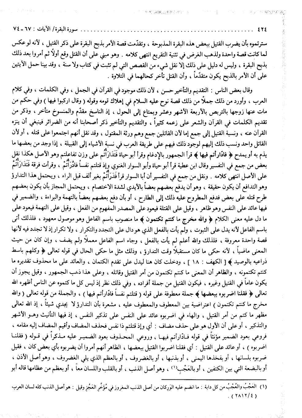 والجملة من قوله تعالى : ) وَاللَّهُ مُخْرِجٌ مَّا كُنتُمْ تَكْتُمُونَ ( اعتراضية بين المعطوف والمعطوف عليه ، مشعرة بأن التدارؤ لا يجدي شيئاً ، إذ الله تعالى مظهر ما كتم من أمر القتيل . والهاء في اضربوه عائد على النفس ، على تذكير النفس ، إذ فيها التأنيث ، وهو الأشهر ، والتذكير ، أو على أو الأول هو على حذف مضاف ، أي وإذ قتلتم ذا نفس ، فحذف المضاف وأقيم المضاف إليه مقامه ، فروعي بعود الضمير مؤنثاً في قوله : ) فَادرَأْتُمْ ( فيها ، وروعي المحذوف بعود الضمير عليه مذكراً في قوله : ) فَقُلْنَا اضْرِبُوهُ ( ، أو عائد على القتيل ، أي ، فقلنا : اضربوا القتيل ببعضها . الظاهر أنهم أمروا أن يضربوه بأي بعض كان ، فقيل : ضربوه بلسانها ، أو بفخذها اليمنى ، أو بذنبها ، أو بالغضروف ، أو بالعظم الذي يلي الغضروف ، وهو أصل الأذن ، أو بالبضغة التي بين الكتفين ، أو بالعجب ، وهو أصل الذنب ، أو بالقلب واللسان معاً ، أو بعظم من عظامها ، قاله أبو