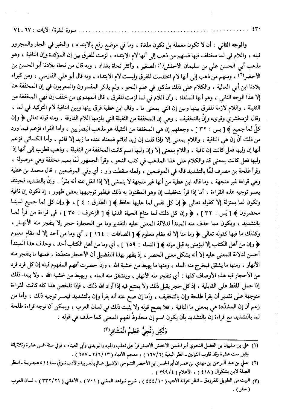 ولم يذكر المفسرون والمعربون في إن المخففة هنا إلا هذا الوجه الثاني ، وهو أنها الملغاة ، وأن اللام في لما لزمت للفرق . قال المهدوي : من خفف إن ، فهي المخففة من الثقيلة ، واللام لازمة للفرق بينها وبين إن التي بمعنى ما . وقال ابن عطية : فرق بينها وبين النافية لام التوكيد في لما . وقال الزمخشري : وقرىء : وإن بالتخفيف ، وهي إن المخففة من الثقيلة التي يلزمها اللام الفارقة ، ومنه قوله تعالى : ) وَإِن كُلٌّ لَّمَّا جَمِيعٌ ( ، وجعلهم إن هي المخففة من الثقيلة ، هو مذهب البصريين . وأما الفراء فزعم فيما ورد من ذلك أنّ إن هي النافية ، واللام بمعنى إلا ، فإذا قلت : إن زيد لقائم ، فمعناه عنده : ما زيد إلا قائم . وأما الكسائي فزعم أنها إن وليها فعل ، كانت إن نافية ، واللام بمعنى إلا ، وإن وليها اسم ، كانت المخففة من الثقيلة . وذهب قطرب إلى أنها إذا وليها فعل ، كانت بمعنى قد ، والكلام على هذا المذهب في كتب النحو .