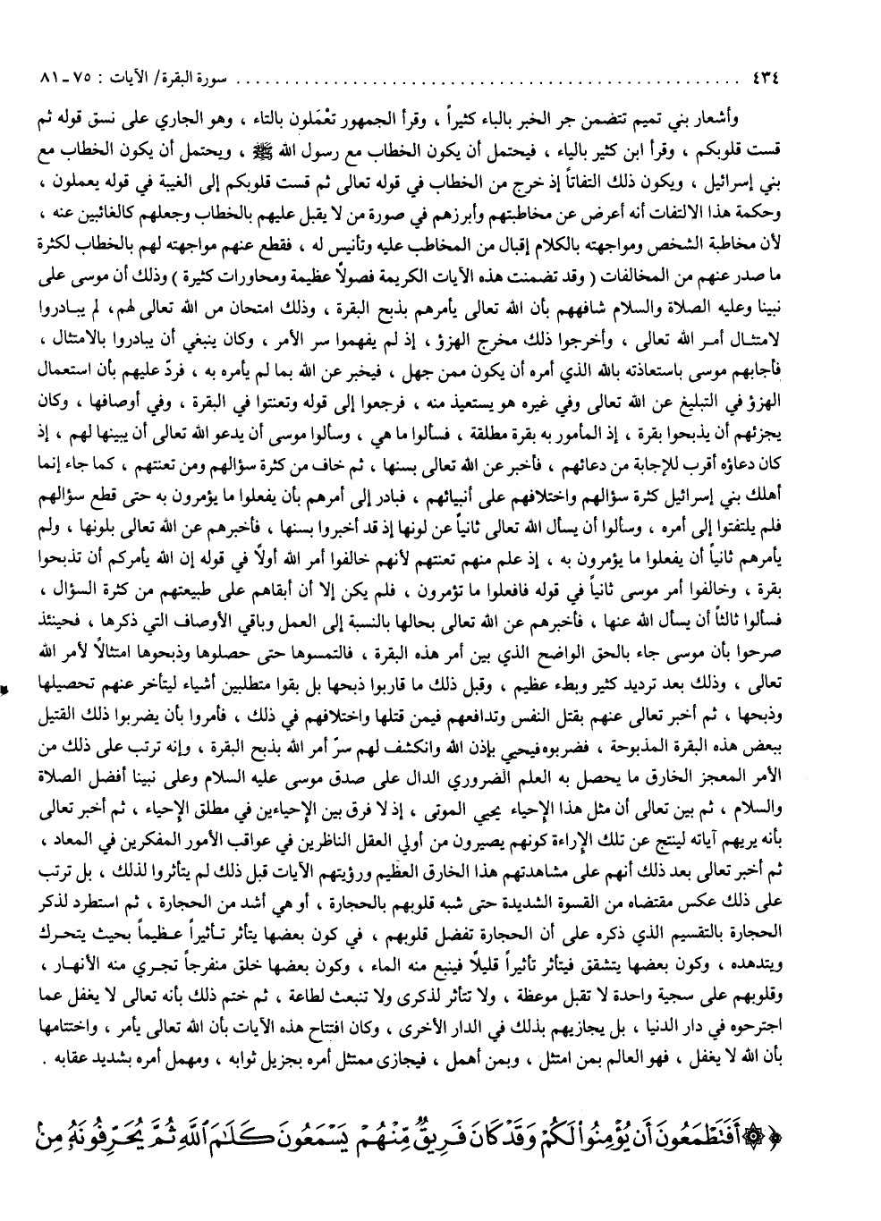ثم أخبر تعالى عنهم بقتل النفس ، وتدافعهم فيمن قتلها ، واختلافهم في ذلك ، فأمروا بأن يضربوا ذلك القتيل ببعض هذه البقرة المذبوحة ، فضربوه فحيي بإذن الله ، وانكشف لهم سرّ أمر الله بذبح البقرة ، وأنه ترتب على ذلك من الأمر المعجز الخارق ، ما يحصل به العلم الضروري الدال على صدق موسى عليه السلام ، وعلى نبينا أفضل الصلاة والسلام . ثم بين تعالى أن مثل هذ الإحياء يحيي الموتى ، إذ لا فرق بين الإحياءين في مطلق الإحياء . ثم أخبر تعالى بأنه يريهم آياته ، لينتج عن تلك الإراءة كونهم يصيرون من أولي العقل ، الناظرين في عواقب الأمور ، المفكرين في المعاد . ثم أخبر تعالى بعد ذلك أنهم على مشاهدتهم هذا الخارق العظيم ، ورؤيتهم الآيات قبل ذلك ، لم يتأثروا لذلك ، بل ترتب على ذلك عكس مقتضاه من القسوة الشديدة ، حتى شبه قلوبهم بالحجارة ، أو هي أشد من الحجارة . ثم استطرد لذكر الحجارة بالتقسيم الذي ذكره ، على أن الحجارة تفضل قلوبهم في كون بعضها يتأثر تأثيراً عظيماً ، بحيث يتحرك ويتدهده ، وكون بعضها يتشقق فيتأثر تأثيراً قليلاً ، فينبع منه الماء ، وكون بعضها خلق منفرجاً تجري منه الأنهار ، وقلوبهم على سجية واحدة ، لا تقبل موعظة ، ولا تتأثر لذكري ، ولا تنبعث لطاعة . ثم ختم ذلك بأنه تعالى لا يغفل عما اجترحوه في دار الدنيا ، بل يجازيهم بذلك في الدار الأخرى . وكان افتتاح هذه الآيات بأن الله تعالى يأمر ، واختتامها بأن الله لا يغفل . فهو العالم بمن امتثل ، وبمن أهمل ، فيجازي ممتثل أمره بجزيل ثوابه ، ومهمل أمره بشديد عقابه .