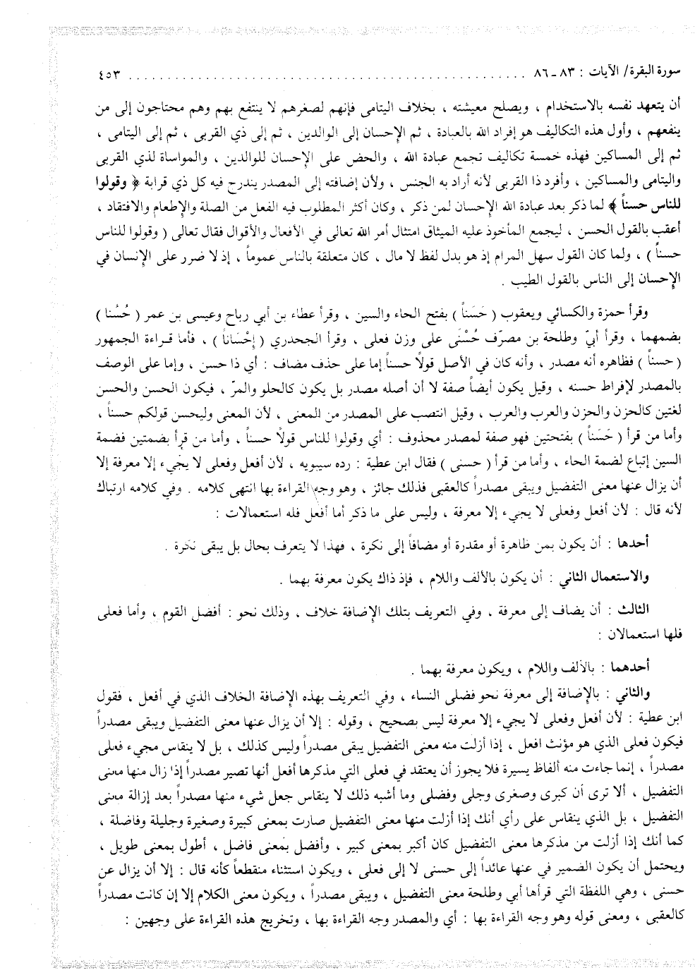 ( وَقُولُواْ لِلنَّاسِ حُسْنًا ( : لما ذكر بعد عبادة الله الإحسان لمن ذكر ، وكان أكثر المطلوب فيه الفعل من الصلة والإطعام والافتقاد ، أعقب بالقول الحسن ، ليجمع المأخوذ عليه الميثاق امتثال أمر الله تعالى في الأفعال والأقوال ، فقال تعالى : ) وَقُولُواْ لِلنَّاسِ حُسْنًا ). ولما كان القول سهل المرام ، إذ هو بدل لفظ لا مال ، كان متعلقه بالناس عموماً إذ لا ضرر على الإنسان في الإحسان إلى الناس بالقول الطيب . وقرأ حمزة والكسائي ويعقوب : حسناً بفتح الحاء والسين . وقرأ عطاء بن أبي رباح وعيسى بن عمر : حسناً بضمهما . وقرأ أبي وطلحة بن مصرّف : حسنى ، على وزن فعل . وقرأ الجحدري : إحساناً . فأما قراءة الجمهور حسناً ، فظاهره أنه مصدر ، وأنه كان في الأصل قولاً حسناً ، أما على حذف مضاف ، أي ذا حسن ، وأما على الوصف بالمصدر لإفراط حسنه ، وقيل : يكون أيضاً صفة ، لا أن أصله مصدر ، بل يكون كالحلو والمرّ ، فيكون الحسن والحسن لغتين ، كالحزن والحزن ، والعرب والعرب . وقيل : انتصب على المصدر من المعنى ، لأن المعنى : وليحسن قولكم حسناً . وأما من قرأ : حسناً بفتحتين ، فهو صفة لمصدر محذوف ، أي وقولوا للناس قولاً حسناً . وأما من قرأ بضمتين ، فضمة السين إتباع لضمة الحاء . وأما من قرأ : حسنى ، فقال ابن عطية : رده سيبويه ، لأن أفعل وفعلى لا يجيء إلا معرفة ، إلا أن يزال عنها معنى التفضيل ويبقى مصدراً ، كالعقبى ، فذلك جائز ، وهو وجه القراءة بها . انتهى كلامه . وفي كلامه ارتباك ، لأنه قال : لأن أفعل وفعلى لا يجيء إلا معرفة ، وليس على ما ذكر . أما أفعل فله استعمالات : أحدها : أن يكون بمن ظاهرة ، أو مقدرة ، أو مضافاً إلى نكرة ، فهذا لا يتعرف بحال ، بل يبقى نكرة . والاستعمال الثاني : أن يكون بالألف واللام ، فإذ ذاك يكون معرفة بهما . الثالث : أن يضاف إلى معرفة ، وفي التعريف بتلك الإضافة خلاف ، وذلك نحو : أفضل القوم . وأما فعلى فلها استعمالان : أحدهما : بالألف واللام ، ويكون معرفة بهما . والثاني : بالإضافة إلى معرفة نحو : فضلى النساء . وفي التعريف بهذه الإضافة الخلاف الذي في أفعل ، فقول ابن عطية : لأن أفعل وفعلى لا يجيء إلا معرفة ، ليس بصحيح . وقوله : إلا أن يزال عنها معنى التفضيل ، ويبقى مصدراً ، فيكون فعلى الذي هو مؤنث أفعل ، إذا أزلت منه معنى التفضيل يبقى مصدراً ، وليس كذلك ، بل لا ينقاس مجيء فعلى مصدراً إنما جاءت منه ألفاظ يسيرة . فلا يجوز أن يعتقد في فعلى ، التي مذكرها أفعل ، أنها تصير مصدراً إذا زال منها معنى التفضيل . ألا ترى أن كبرى وصغرى وجلى وفضلى ، وما أشبه ذلك ، لا ينقاس جعل شيء منها مصدراً بعد إزالة معنى التفضيل ؟ بل الذي ينقاس على رأس أنك إذا أزلت منها معنى التفضيل ، صارت بمعنى : كبيرة وصغيرة وجليلة وفاضلة . كما أنك إذا أزلت من مذكرها معنى التفضيل ، كان أكبر بمعنى كبير ، وأفضل بمعنى فاضل ، وأطول بمعنى طويل . ويحتمل أن يكون الضمير في عنها عائداً إلى حسنى ، لا إلى فعلى ، ويكون استثناء منقطعاً ، كأنه قال : إلا أن يزال عن حسنى ، وهي اللفظة التي قرأها أبي وطلحة معنى التفضيل ، ويبقى مصدراً ، ويكون معنى الكلام إلا إن كانت مصدراً ، كالعقبى . ومعنى قوله : وهو وجه القراءة بها ، أي والمصدر وجه القراءة بها . وتخريج هذه القراءة على وجهين :