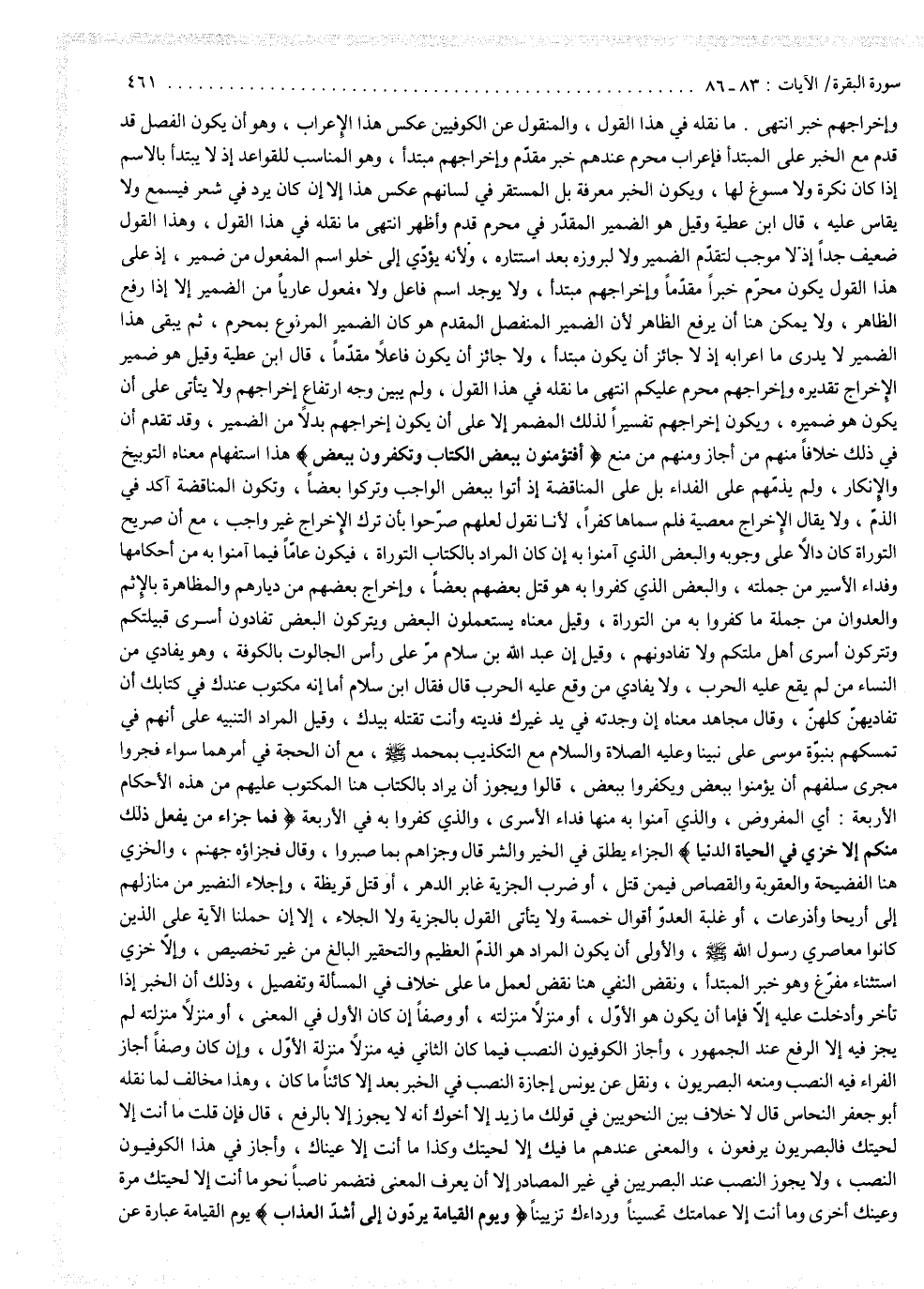 ( أَفَتُؤْمِنُونَ بِبَعْضِ الْكِتَابِ وَتَكْفُرُونَ بِبَعْضٍ ( : هذا استفهام معناه التوبيخ والإنكار . ولم يذمّهم على الفداء ، بل على المناقضة ، إذ أتوا ببعض الواجب ، وتركوا بعضاً . وتكون المناقضة آكد في الذمّ ، ولا يقال الإخراج معصية . فلم سماها كفراً ؟ لأنا نقول : لعلهم صرّحوا بأن ترك الإخراج غير واجب ، مع أن صريح التوراة كان دالاً على وجوبه . والبعض الذي آمنوا به ، إن كان المراد بالكتاب التوراة ، فيكون عامًّا فيما آمنوا به من أحكامها ، وفداء الأسير من جملته . والبعض الذي كفروا به : هو قتل بعضهم بعضاً ، وإخراج بعضهم من ديارهم ، والمظاهرة بالإثم والعدوان ، من جملة ما كفروا به من التوراة . وقيل : معناه يستعملون البعض ويتركون البعض ، تفادون أسرى قبيلتكم ، وتتركون أسرى أهل ملتكم ولا تفادونهم . وقيل : إن عبد الله بن سلام مرّ على رأس الجالوت بالكوفة ، وهو يفادي من النساء من لم يقع عليه الحرب ، ولا يفادي من وقع عليه الحرب . قال : فقال ابن سلام : أما إنه مكتوب عندك في كتابك أن تفاديهنّ كلهنّ . وقال مجاهد : معناه إن وجدته في يد غيرك فديته ، وأنت تقتله بيدك . وقيل : المراد التنبيه على أنهم في تمسكهم بنبوّة موسى ، على نبينا وعليه الصلاة والسلام ، مع التكذيب بمحمد ( صلى الله عليه وسلم ) ) ، مع أن الحجة في أمرهما سواء ، فجروا مجرى سلفهم ، أن يؤمنوا ببعض ، ويكفروا ببعض . قالوا : ويجوز أن يراد بالكتاب هنا المكتوب عليهم من هذه الأحكام الأربعة ، أي المفروض ، والذي آمنوا به منها فداء الأسرى ، والذي كفروا به باقي الأربعة .