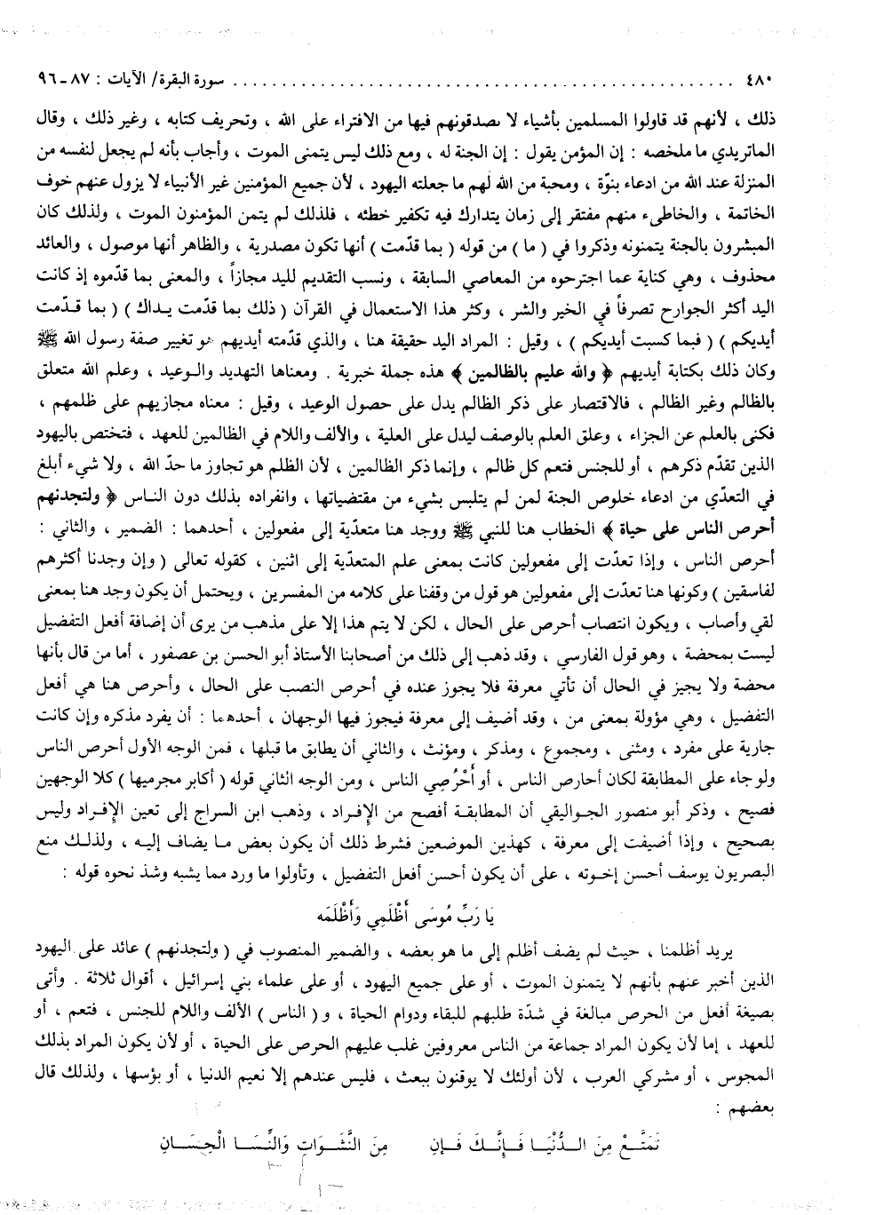 ( وَلَتَجِدَنَّهُمْ أَحْرَصَ النَّاسِ عَلَى حَيَواةٍ ( : الخطاب هنا للنبي ( صلى الله عليه وسلم ) ) . ووجد هنا متعدّية إلى مفعولين : أحدهما الضمير ، والثاني أحرص الناس . وإذا تعدّت إلى مفعولين كانت بمعنى علم المتعدّية إلى اثنين ، كقوله تعالى : ) وَإِن وَجَدْنَا أَكْثَرَهُمْ لَفَاسِقِينَ ). وكونها هنا تعدّت إلى مفعولين ، هو قول من وفقنا على كلامه من المفسرين . ويحتمل أن يكون وجد هنا بمعنى لقي وأصاب ، ويكون انتصاب أحرص على الحال ، لكن لا يتم هذا إلا على مذهب من يرى أن إضافة أفعل التفضيل ليست بمحضة ، وهو قال الفارسي . وقد ذهب إلى ذلك من أصحابنا الأستاذ أبو الحسن بن عصفور . أما من قال بأنها محضة ، ولا يجيز في الحال أن تأتي معرفة ، فلا يجوز عنده في أحرص النصب على الحال . وأحرص هنا هي أفعل التفضيل ، وهي مؤولة . بمعنى من ، وقد أضيف إلى معرفة ، فيجوز فيها الوجهان : أحدهما : أن يفرد مذكره ، وإن كانت جارية على فرد ومثنى ومجموع ، ومذكر ومؤنث . والثاني : أن يطابق ما قبلها . فمن الوجه الأول أحرص الناس ولو جاء على المطابقة ، لكان أحارص الناس ، أو أحرصي الناس . ومن الوجه الثاني قوله : أكابر مجرميها ، كلا الوجهين فصيح . وذكر أبو منصور الجواليقي أن المطابقة أفصح من الإفراد . وذهب ابن السراج إلى تعين الإفراد ، وليس بصحيح . وإذا أضيفت إلى معرفة ، كهذين الموضعين ، فشرط ذلك أن يكون بعض ما يضاف إليه ، ولذلك منع البصريون يوسف أحسن إخوته ، على أن يكون أحسن أفعل التفضيل ، وتأولوا ما ورد مما يشبهه ، وشذ نحو قوله :