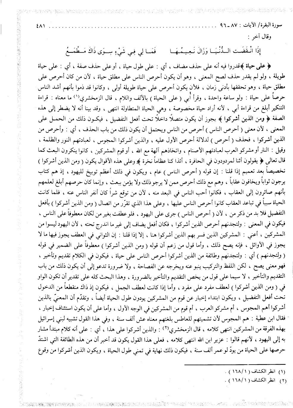 ) عَلَى حَيَواةٍ ( : قدروا فيه أنه على حذف مضاف ، أي على طول حياة ، أو على حذف صفة ، أي على حياة طويلة . ولو لم يقدر حذف لصح المعنى ، وهو أن يكون أحرص الناس على مطلق حياة ، لأن من كان أحرص على مطلق حياة ، وهو تحققها بأدنى زمان ، فلأن يكون أحرص على حياة طويلة أولى ، وكانوا قد ذموا بأنهم أشد الناس حرصاً على حياة ، ولو ساعة واحدة . وقرأ أبي : على الحياة ، بالألف واللام . قال الزمخشري ما معناه : قراءة التنكير أبلغ من قراءة أبي ، لأنه أراد حياة مخصوصة ، وهي الحياة المتطاولة . انتهى . وقد بينا أنه لا يضطر إلى هذه الصفة .