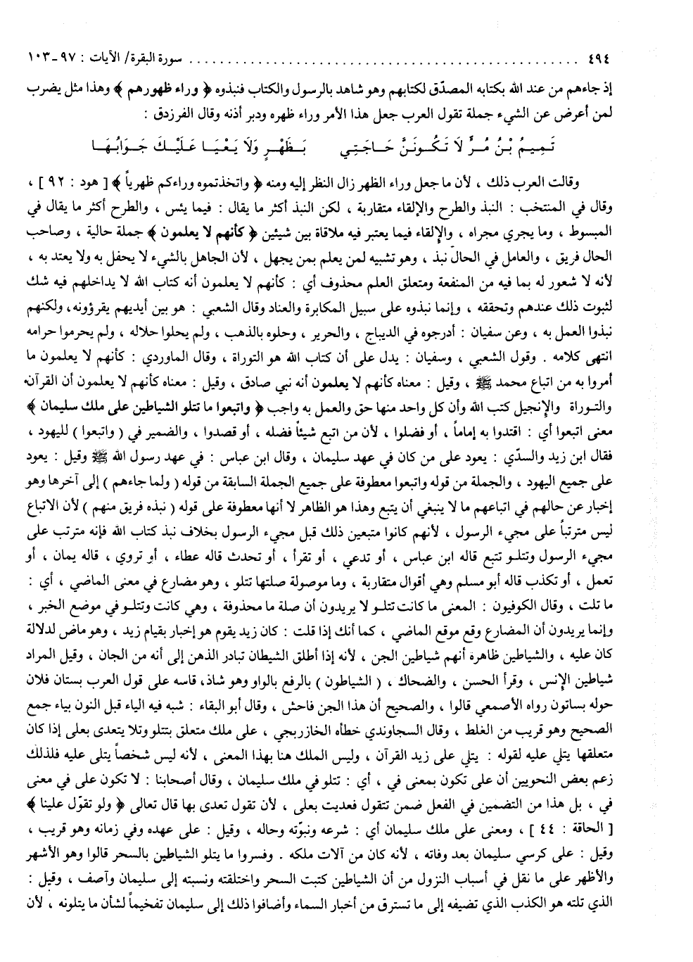 ( وَاتَّبَعُواْ مَا تَتْلُواْ الشَّيَاطِينُ عَلَى مُلْكِ سُلَيْمَانَ ( ، معنى تبعوا : أي اقتدوا به إماماً ، أو فضلوا ، لأن من اتبع شيئاً فضله ، أو قصد واو الضمير في واتبعوا لليهود ، فقال ابن زيد والسدّي : يعود على من كان في عهد سليمان . وقال ابن عباس : في عهد رسول الله ( صلى الله عليه وسلم ) ) . وقيل : يعود على جميع اليهود . والجملة من قوله : واتبعوا ، معطوفة على جميع الجملة السابقة من قوله : ولما جاءهم إلى آخرها ، وهو إخبار عن حالهم في اتباعهم ما لا ينبغي أن يتبع ، وهذا هو الظاهر ، لا أنها معطوفة على قوله : نبذه فريق منهم ، لأن الاتباع ليس مترتباً على مجيء الرسول ، لأنهم كانوا متبعين ذلك قبل مجيء الرسول ، بخلاف نبذ كتاب الله ، فإنه مترتب على مجيء الرسول . وتتلو : تتبع ، قاله ابن عباس ، أو تدعي ، أو تقرأ ، أو تحدث ، قاله عطاء ، أو تروي ، قاله يمان ، أو تعمل ، أو تكذب ، قاله أبو مسلم . وهي أقوال متقاربة . وما موصولة ، صلتها تتلو ، وهو مضارع في معنى الماضي ، أي ما تلت . وقال الكوفيون : المعنى : ما كانت تتلو ، لا يريدون أن صلة ما محذوفة ، وهي كانت وتتلو ، في موضع الخبر ، وإنما يريدون أن المضارع وقع موقع الماضي ، كما أنك إذا قلت : كان زيد يقوم ، هو إخبار بقيام زيد ، وهو ماض لدلالة كان عليه . والشياطين : ظاهره أنهم شياطين الجن ، لأنه إذا أطلق الشيطان ، تبادر الذهن إلى أنه من الجان . وقيل : المراد شياطين الإنس . وقرأ الحسن والضحاك : الشياطون ، بالرفع بالواو ، هو شاذ ، فاسه على قول العرب : بستان فلان حوله بساتون ، رواه الأصمعي . قالوا : والصحيح أن هذا الجن فاحش . وقال أبو البقاء : شبه فيه الياء قبل النون بياء جمع الصحيح ، وهو قريب من الغلط . وقال السجاوندي : خطأه الخازربجي .