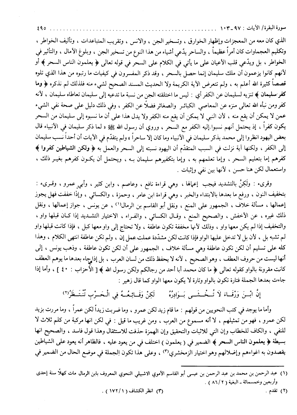 ( وَلَاكِنَّ الشَّيْاطِينَ كَفَرُواْ ( : كفرهم ، إما بتعليم السحر ، وإما تعلمهم به ، وإما بتكفيرهم سليمان به ، ويحتمل أن يكون كفرهم بغير ذلك . واستعمال لكن هنا حسن ، لأنها بين نفي وإثبات . وقرىء : ولكنّ بالتشديد ، فيجب إعمالها ، وهي قراءة نافع وعاصم وابن كثير وأبي عمرو . وقرىء : بتخفيف النون ورفع ما بعدها بالابتداء والخبر ، وهي قراءة ابن عامر وحمزة والكسائي . وإذا خففت ، فهل يجوز إعمالها ؟ مسألة خلاف الجمهور على المنع ونقل أبو القاسم بن الرماك عن يونس جواز إعمالها ، ونقل ذلك غيره عن الأخفش ، والصحيح المنع . وقال الكسائي والفراء : الاختيار ، التشديد إذا كان قبلها واو ، والتخفيف إذا لم يكن معها واو ، وذلك لأنها مخففة تكون عاطفة ولا تحتاج إلى واو معها . كبل : فإذا كانت قبلها واو لم تشبه بل ، لأن بل لا تدخل عليها الواو ، فإذا كانت لكن مشدّدة عملت عمل إن ، ولم تكن عاطفة . انتهى الكلام . وهذا كله على تسليم أن لكن تكون عاطفة ، وهي مسألة خلاف الجمهور على أن لكنّ تكون عاطفة . وذهب يونس إلى أنها لبيست من حروف العطف ، وهو الصحيح لأنه لا يحفظ ذلك من لسان العرب ، بل إذا جاء بعدها ما يوهم العطف ، كانت مقرونة بالواو كقوله تعالى : ) مَّا كَانَ مُحَمَّدٌ أَبَا أَحَدٍ مّن رّجَالِكُمْ وَلَاكِن رَّسُولَ اللَّهِ ). وأما إذا جاءت بعدها الجملة ، فتارة تكون بالواو ، وتارة لا يكون معها الواو ، كما قال زهير : إن ابن ورقاء لا تخشى بوادره