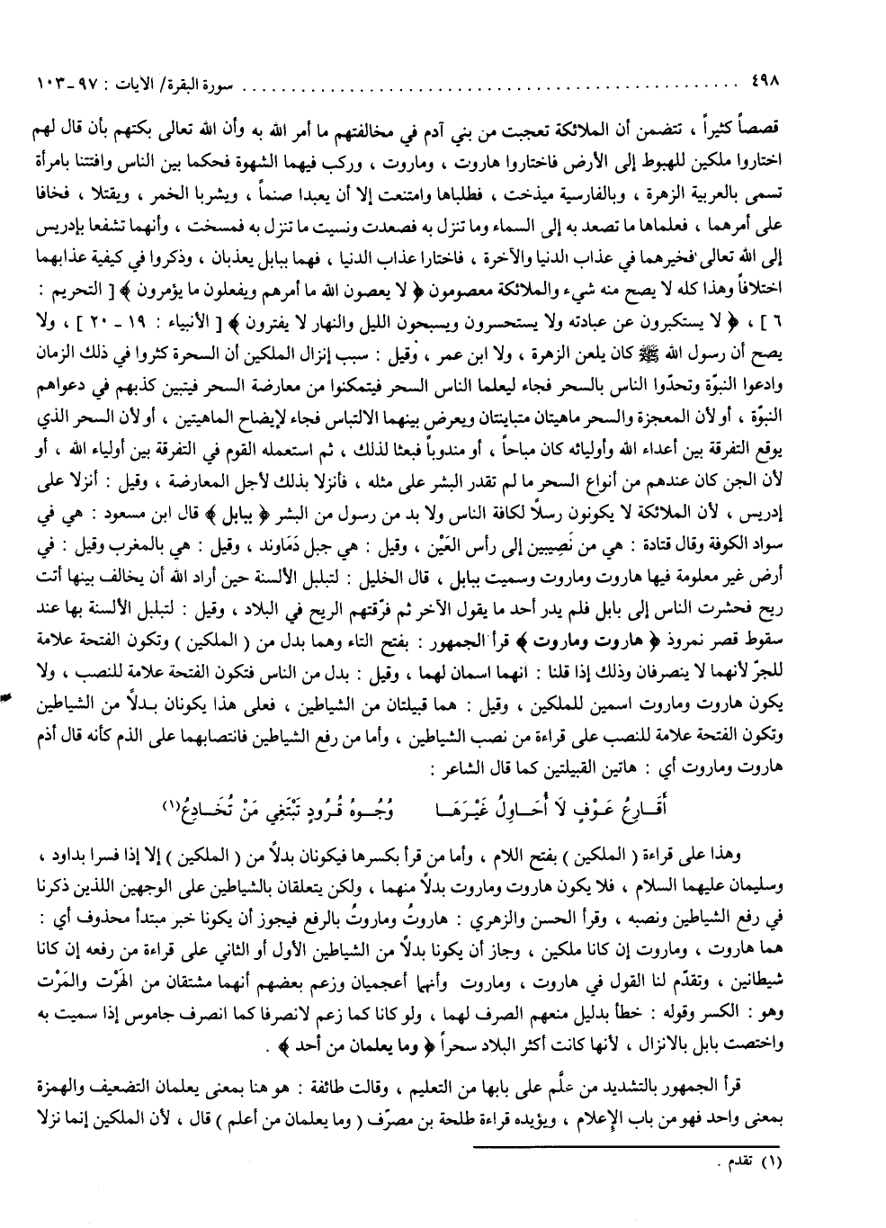 قصصاً كثيراً ، تتضمن : أن الملائكة تعجبت من بني آدم في مخالفتهم ما أمر الله به ، وأن الله تعالى بكتهم ، بأن قال لهم : اختاروا ملكين للهبوط إلى الأرض ، فاختاروا هاروت وماروت ، وركب فيهما الشهوة ، فحكما بين الناس ، وافتتنا بامرأة ، تسمى بالعربية الزهرة ، وبالفارسية ميذخت ، فطلباها وامتنعت ، إلا أن يعبدا صنماً ، ويشربا الخمر ويقتلا . فخافا على مرهما ، فعلماها ما تصعد به إلى السماء وما تنزل به ، فصعدت ونسيت ما تنزل به ، فمسخت . وأنهما تشفعا بإدريس إلى الله تعالى ، فخيرهما في عذاب الدنيا والآخرة ، فاختارا عذاب الدنيا ، فهما ببابل يعذبان . وذكروا في كيفية عذابهما اختلافاً . وهذا كله لا يصح منه شيء . والملائكة معصومون ، ( لاَّ يَعْصُونَ اللَّهَ مَا أَمَرَهُمْ وَيَفْعَلُونَ مَا يُؤْمَرُونَ ( ، ( لاَ يَسْتَكْبِرُونَ عَنْ عِبَادَتِهِ وَلاَ يَسْتَحْسِرُونَ ( ، ( يُسَبّحُونَ الْلَّيْلَ وَالنَّهَارَ لاَ يَفْتُرُونَ ). ولا يصح أن رسول الله ( صلى الله عليه وسلم ) ) كان يلعن الزهرة ولا ابن عمر . وقيل : سبب إنزال الملكين : أن السحرة كثروا في ذلك الزمان ، وادعوا النبوّة ، وتحدّوا الناس بالسخر . فجاء ليعلما الناس السحر ، فيتمكنوا من معاوضة السحر ، فيتبين كذبهم في دعواهم النبوّة ، أو لأن المعجزة والسحر ماهيتان متباينتان ، ويعرض بينهما الالتباس . فجاء الإيضاح الماهيتين ، أو لأن السحر الذي يوقع التفرقة بين أعداء الله وأوليائه كان مباحاً ، أو مندوباً ، فبعثا لذلك ، ثم استعمله القوم في التفرقة بين أولياء الله . أو لأن الجن كان عندهم من أنواع السحر ما لم تقدر البشر على مثله ، فأنزلا بذلك لأجل المعارضة . وقيل : أنزلا على إدريس ، لأن الملائكة لا يكونون رسلاً لكافة الناس ، ولا بد من رسول من البشر .
