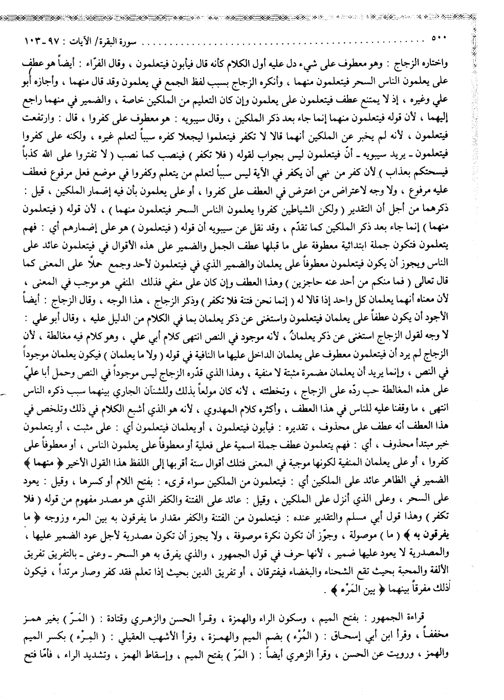 واختاره الزجاج ، وهو معطوف على شيء دل عليه أول الكلام ، كأنه قال : فيأبون فيتعلمون . وقال الفرّاء أيضاً : هو عطف على ) يُعَلّمُونَ النَّاسَ السّحْرَ ( ، ( فَيَتَعَلَّمُونَ مِنْهُمَا ). وأنكره الزجاج بسبب لفظ الجمع في يعلمون ، وقد قال منهما . وأجازه أبو علي وغيره ، إذ لا يمتنع عطف فيتعلمون على يعلمون ، وإن كان التعليم من الملكين خاصة ، والضمير في منهما راجع إليهما ، لأن قوله : فيتعلمون منهما ، إنما جاء بعد ذكر الملكين . وقال سيبويه : هو معطوف على كفروا ، قال : وارتفعت فيتعلمون ، لأنه لم يخبر عن الملكين أنهما قالا : لا تكفر ، فيتعلموا ليجعلا كفره سبباً لتعلم غيره ، ولكنه على كفروا فيتعلمون . يريد سيبويه : أنّ فيتعلمون ليس بجواب لقوله : فلا تكفر ، فينصب كما نصب ) لاَ تَفْتَرُواْ عَلَى اللَّهِ كَذِباً فَيُسْحِتَكُم بِعَذَابٍ ( ، لأن كفر من نهي أن يكفر في الآية ، ليس سبباً لتعلم من يتعلم . وكفروا : في موضع فعل مرفوع ، فعطف عليه مرفوع ، ولا وجه لاعتراض من اعترض في العطف على كفروا ، أو على يعلمون ، بأن فيه إضمار الملكين . قيل : ذكرهما من أجل أن التقدير : ) وَلَاكِنَّ الشَّيْاطِينَ كَفَرُواْ يُعَلّمُونَ النَّاسَ السّحْرَ فَيَتَعَلَّمُونَ مِنْهُمَا ( ، لأن قوله : ) فَيَتَعَلَّمُونَ مِنْهُمَا ( إنما جاء بعد ذكر الملكين ، كما تقدّم . وقد نقل عن سيبويه أن قوله : فيتعلمون ، هو على إضمارهم ، أي فهم يتعلمون ، فتكون جملة ابتدائية معطوفة على ما قبلها عطف الجمل ، والضمير على هذه الأقوال في فيتعلمون عائد على الناس ، ويجوز أن يكون فيتعلمون معطوفاً على يعلمان ، والضمير الذي في فيتعلمون لأحد ، وجمع حملاً على منفى ، فذلك المنفي هو موجب في المعنى ، لأن معناه : إنهما يعلمان كل واحد ، إذا قالا له : إنما نحن فتنة فلا تكفر . وذكر الزجاج هذا الوجه . وقال الزجاج أيضاً : الأجود أن يكون عطفاً على يعلمان فيتعلمون ، واستغنى عن ذكر يعلمان ، بما في الكلام من الدليل عليه . وقال أبو علي : لا وجه لقول الزجاج استغنى عن ذكر يعلمان ، لأنه موجود في النص . انتهى كلام أبي علي ، وهو كلام فيه مغالطة ، لأن الزجاج لم يرد أن فيتعلمون معطوف على يعلمان ، الداخل عليها ما النافية في قوله : ولا ما يعلمان ، فيكون يعلمان موجوداً في النص ، وإنما يريد أن يعلمان مضمرة مثبتة لا منفية . وهذا الذي قدّره الزجاج ليس موجوداً في النص . وحمل أبا عليّ على هذه المغالطة حب ردّه على الزجاج وتخطئته ، لأنه كان مولعاً بذلك . وللشنآن الجاري بينهما سبب ذكره الناس . انتهى ما وقفنا عليه للناس في هذا العطف ، وأكثره كلام المهدوي ، لأنه هو الذي أشبع الكلام في ذلك . وتلخص في هذا العطف أنه عطف على محذوف تقدير : فيأبون فيتعلمون ، أو يعلمان فيتعلمون ، أي على مثبت ، أو يتعلمون خبر مبتدأ محذوف ، أي فهم يتعلمون عطف جملة اسمية على فعلية ، أو معطوفاً على يعلمون الناس ، أو معطوفاً على كفروا ، أو على يعلمان المنفية لكونها موجبة في المعنى . فتلك أقوال ستة ، أقر بها إلى اللفظ هذا القول الأخير .