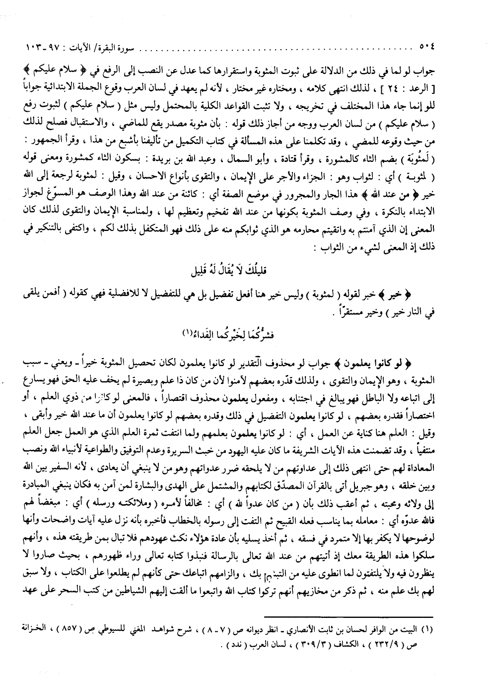 جواب لو لما في ذلك من الدلالة على ثبوت المثوبة واستقرارها ، كما عدل عن النصب إلى الرفع في : سلام عليكم لذلك ، انتهى كلامه . ومختاره غير مختار ، لأنه لم يعهد في لسان العرب وقوع الجملة الابتدائية جواباً للو ، إنما جاء هذا المختلف في تخريجه . ولا تثبت القواعد الكلية بالمحتمل ، وليس مثل سلام عليكم ، لثبوت رفع سلام عليكم من لسان العرب . ووجه من أجاز ذلك قوله : بأن مثوبة مصدر يقع للماضي والاستقبال ، فصلح لذلك من حيث وقوعه للمضي . وقد تكلمنا على هذه المسألة في ( كتاب التكميل ) من تأليفنا ، بأشبع من هذا . وقرأ الجمهور : لمثوبة بضم الثاء ، كالمشورة . وقرأ قتادة وأبو السمال وعبد الله بن بريدة : بسكون الثاء ، كمشورة . ومعنى قوله : لمثوبة ، أي لثواب ، وهو الجزاء والأجر على الإيمان والتقوى بأنواع الإحسان . وقيل : لمثوبة : لرجعة إلى الله خير .