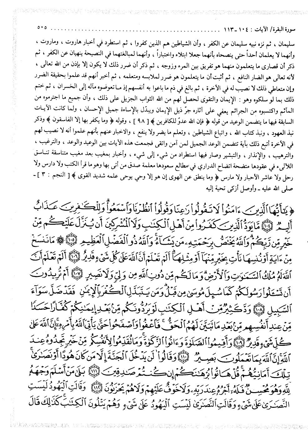 2 ( ) يَاأَيُّهَا الَّذِينَ ءَامَنُواْ لاَ تَقُولُواْ رَاعِنَا وَقُولُواْ انظُرْنَا وَاسْمَعُواْ وَلِلكَافِرِينَ عَذَابٌ أَلِيمٌ مَّا يَوَدُّ الَّذِينَ كَفَرُواْ مِنْ أَهْلِ الْكِتَابِ وَلاَ الْمُشْرِكِينَ أَن يُنَزَّلَ عَلَيْكُم مِّنْ خَيْرٍ مِّن رَّبِّكُمْ وَاللَّهُ يَخْتَصُّ بِرَحْمَتِهِ مَن يَشَآءُ وَاللَّهُ ذُو الْفَضْلِ الْعَظِيمِ مَا نَنسَخْ مِنْ ءَايَةٍ أَوْ نُنسِهَا نَأْتِ بِخَيْرٍ مِّنْهَا أَوْ مِثْلِهَا أَلَمْ تَعْلَمْ أَنَّ اللَّهَ عَلَى كُلِّ شَيْءٍ قَدِيرٌ أَلَمْ تَعْلَمْ أَنَّ اللَّهَ لَهُ مُلْكُ السَّمَاوَاتِ وَالأَرْضِ وَمَا لَكُم مِّن دُونِ اللَّهِ مِن وَلِيٍّ وَلاَ نَصِيرٍ أَمْ تُرِيدُونَ أَن تَسْألُواْ رَسُولَكُمْ كَمَا سُئِلَ مُوسَى مِن قَبْلُ وَمَن يَتَبَدَّلِ الْكُفْرَ بِالإِيمَانِ فَقَدْ ضَلَّ سَوَآءَ السَّبِيلِ وَدَّ كَثِيرٌ مِّنْ أَهْلِ الْكِتَابِ لَوْ يَرُدُّونَكُم مِن بَعْدِ إِيمَانِكُمْ كُفَّارًا حَسَدًا مِّنْ عِنْدِ أَنْفُسِهِمْ مِّن بَعْدِ مَا تَبَيَّنَ لَهُمُ الْحَقُّ فَاعْفُواْ وَاصْفَحُواْ حَتَّى يَأْتِىَ اللَّهُ بِأَمْرِهِ إِنَّ اللَّهَ عَلَى كُلِّ شَىْءٍ قَدِيرٌ وَأَقِيمُواْ الصَّلَواةَ وَءَاتُواْ الزَّكَواةَ وَمَا تُقَدِّمُواْ لأَنْفُسِكُم مِّنْ خَيْرٍ تَجِدُوهُ عِندَ اللَّهِ إِنَّ اللَّهَ بِمَا تَعْمَلُونَ بَصِيرٌ وَقَالُواْ لَن يَدْخُلَ الْجَنَّةَ إِلاَّ مَن كَانَ هُودًا أَوْ نَصَارَى تِلْكَ أَمَانِيُّهُمْ قُلْ هَاتُواْ بُرْهَانَكُمْ إِن كُنتُمْ صَادِقِينَ بَلَى مَنْ أَسْلَمَ وَجْهَهُ لِلَّهِ وَهُوَ مُحْسِنٌ فَلَهُ أَجْرُهُ عِندَ رَبِّهِ وَلاَ خَوْفٌ عَلَيْهِمْ وَلاَ هُمْ يَحْزَنُونَ وَقَالَتِ الْيَهُودُ لَيْسَتِ النَّصَارَى عَلَى شَىْءٍ وَقَالَتِ النَّصَارَى لَيْسَتِ الْيَهُودُ عَلَى شَىْءٍ وَهُمْ يَتْلُونَ الْكِتَابَ كَذَالِكَ قَالَ الَّذِين