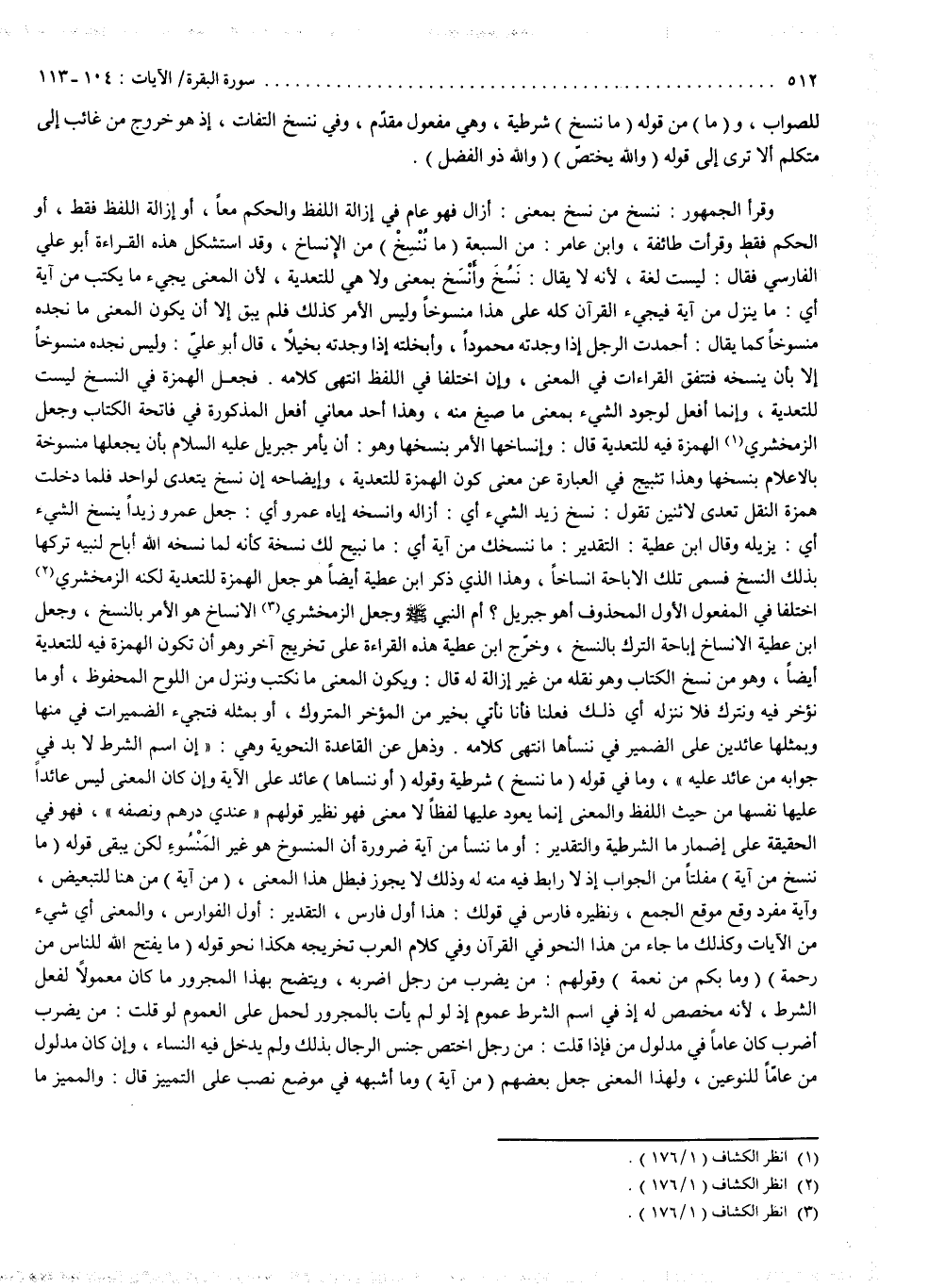 وما من قوله : ما ننسخ ، شرطية ، وهي مفعول مقدّم ، وفي ننسخ التفات ، إذ هو خروج من غائب إلى متكلم . ألا ترى إلى قوله : ) وَاللَّهُ يَخْتَصُّ ( ؟ ) وَاللَّهُ ذُو الْفَضْلِ ( ؟ وقرأ الجمهور : ننسخ من نسخ ، بمعنى أزال ، فهو عام في إزالة اللفظ والحكم معاً ، أو إزالة اللفظ فقط ، أو الحكم فقط . وقرأت طائفة وابن عامر من السبعة : ما ننسخ من الإنساخ ، وقد استشكل هذه القراءة أبو علي الفارسي فقال : ليست لغة ، لأنه لا يقال نسخ وأنسخ بمعنى ، ولا هي للتعدية ، لأن المعنى يجيء : ما يكتب من آية ، أي ما ينزل من آية ، فيجيء القرآن كله على هذا منسوخاً . وليس الأمركذلك ، فلم يبق إلا أن يكون المعنى : ما نجده منسوخاً ، كما يقال : أحمدت الرجل إذا وجدته محموداً ، وأبخلته إذا وجدته بخيلاً . قال أبو عليّ : وليس نجده منسوخاً إلا بأن ينسخه ، فتتفق القراءات في المعنى ، وإن اختلفا في اللفظ . انتهى كلامه . فجعل الهمزة في النسخ ليست للتعدية ، وإنما أفعل لوجود الشيء بمعنى ما صيغ منه ، وهذا أحد معاني أفعل المذكورة فيه فاتحة الكتاب . وجعل الزمخشري الهزة فيه للتعدية قال : وإنساخها الأمر بنسخها ، وهو أن يأمر جبريل عليه السلام بأن يجعلها منسوخة ، بالإعلام بنسخها ، وهذا تثبيج في العبارة عن معنى كون الهمزة للتعدية . وإيضاحه أن نسخ يتعدى لواحد ، فلما دخلت همزة النقل تعدى لاثنين . تقول : نسخ زيد الشيء ، أي أزاله ، وأنسخه إياه عمرو : أي جعل عمرو زيداً ينسخ الشيء ، أي يزيله . وقال ابن عطية : التقدير ما ننسخك من آية ، أي ما نبيح لك نسخة ، كأنه لما نسخه الله أباح لنبيه تركها بذلك النسخ ، فسمى تلك الإباحة إنساخاً . وهذا الذي ذكر ابن عطية أيضاً هو جعل الهمزة للتعدية ، لكنه والزمخشري اختلفا في المفعول الأول المحذوف ، أهو جبريل أم النبي ( صلى الله عليه وسلم ) ) ؟ وجعل الزمخشري الإنساخ هو الأمر بالنسخ . وجعل ابن عطية الإنساخ إباحة الترك بالنسخ . وخرّج ابن عطية هذه القراءة على تخريج آخر وهو : أن تكون الهمزة فيه للتعدية أيضاً ، وهو من نسخ الكتاب ، وهو نقله من غير إزالة له ، قال : ويكون المعنى ما نكتب وننزل من اللوح المحفوظ ، أو ما نؤخر فيه ونترك فلا ننزله ، أي ذلك فعلنا ، فإنا نأتي بخير من المؤخر المتروك ، أو بمثله ، فتجيء الضميرات في منها وبمثلها عائدين على الضمير في ننسأها . انتهى كلامه . وذهل عن القاعدة النحوية ، وهي أن اسم الشرط لا بد في جوابه من عائد عليه . وما في قوله : ما ننسخ شرطية ، وقوله : أو ننساها ، عائد على الآية ، وإن كان المعنى ليس عائداً عليها نفسها من حيث اللفظ والمعنى ، إنما يعود عليها لفظاً لا معنى ، فهو نظير قولهم : عندي درهم ونصفه ، فهو في الحقيقة على إضمار ما الشرطية . التقدير : أو ما ننسأ من آية ، ضرورة أن المنسوخ هو غير المنسوء ، لكن يبقى قوله : ) مَا نَنسَخْ مِنْ ءايَةٍ ( مفلتاً من الجواب ، إذ لا رابط فيه منه له ، وذلك لا يجوز ، فبطل هذا المعنى .