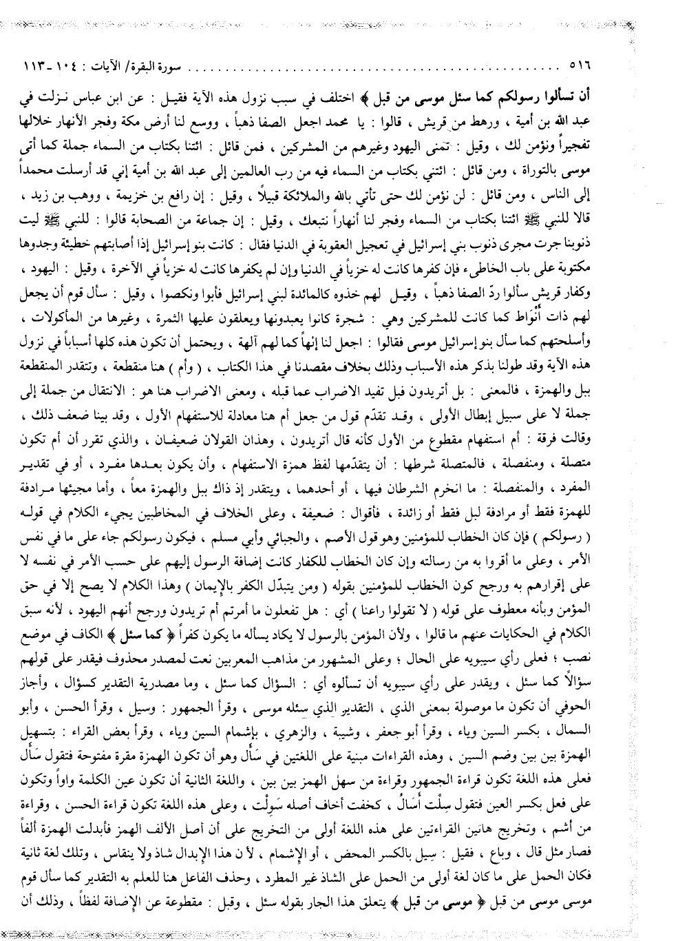 أَن تَسْئَلُواْ رَسُولَكُمْ كَمَا سُئِلَ مُوسَى مِن قَبْلُ ( : اختلف في سبب نزول هذه الآية ، فقيل عن ابن عباس : نزلت في عبد الله بن أمية ورهط من قريش ، قالوا : يا محمد اجعل الصفا ذهباً ، ووسع لنا أرض مكة ، وفجر الأنهار خلالها تفجيراً ، ونؤمن لك . وقيل : تمنى اليهود وغيرهم من المشركين ، فمن قائل : ائتنا بكتاب من السماء جملة ، كما أتى موسى بالتوراة . ومن قائل : ائتني بكتاب من السماء فيه : من رب العالمين إلى عبد الله بن أمية ، إني قد أرسلت محمداً إلى الناس . ومن قائل : لن نؤمن لك حتى تأتي بالله والملائكة قبيلاً . وقيل : إن رافع بن خزيمة ، ووهب بن زيد قالا للنبي ( صلى الله عليه وسلم ) ) : ائتنا كتاب من السماء ، وفجر لنا أنهاراً ، نتبعك . وقيل : إن جماعة من الصحابة قالوا للنبي ( صلى الله عليه وسلم ) ) : ليت ذنوبنا جرت مجرى ذنوب بني إسرائيل في تعجيل العقوبة في الدنيا ، فقال : ( كانت بنو إسرائيل إذا أصابتهم خطيئة وجدوها مكتوبة على باب الخاطىء ، فإن كفرها كانت له خزياً في الدنيا ، وإن لم يكفرها كانت له خزياً في الآخرة ) . وقيل : اليهود وكفار قريش سألوا ردّ الصفا ذهباً ، وقيل لهم : خذوه كالمائدة لبني إسرائيل ، فأبوا ونكصوا . وقيل : سأل قوم أن يجعل لهم ذات أنواط ، كما كانت للمشركين ، وهي شجرة كانوا يعبدونها ويعلقون عليها الثمرة وغيرها من المأكولات وأسلحتهم . كما سأل بنو إسرائيل موسى فقالوا : اجعل لنا إلهاً كما لهم آلهة . ويحتمل أن تكون هذه كلها أسباباً في نزول هذه الآية ، وقد طولنا بذكر هذه الأسباب ، وذلك بخلاف مقصدنا في هذا الكتاب .