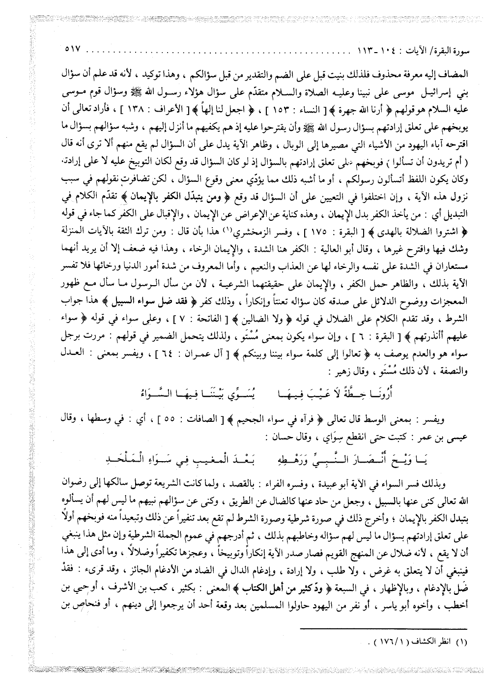 وبذلك فسر السواء في الآية أبو عبيدة ، وفسره الفراء بالقصد . ولما كانت الشريعة توصل سالكها إلى رضوان الله تعالى ، كنى عنها بالسبيل ، وجعل من حاد عنها : كالضال عن الطريق ، وكنى عن سؤالهم نبيهم ما ليس لهم أن يسألوه بتبدل الكفر بالإيمان ، وأخرج ذلك في صورة شرطية ، وصورة الشرط لم تقع بعد تنفيراً عن ذلك ، وتبعيداً منه . فوبخهم أولاً على تعلق إرادتهم بسؤال ما ليس لهم سؤاله ، وخاطبهم بذلك ، ثم أدرجهم في عموم الجملة الشرطية . وإن مثل هذا ينبغي أن لا يقع ، لأنه ضلال عن المنهج القويم ، فصار صدر الآية إنكاراً وتوبيخاً ، وعجزها تكفيراً وضلالاً . وما أدى إلى هذا فينبغي أن لا يتعلق به غرض ولا طلب ولا إرادة . وإدغام الدال في الضاد من الإدغام الجائز . وقد قرىء : ) فَقَدْ ضَلَّ ( ، بالإدغام وبالإظهار في السبعة .