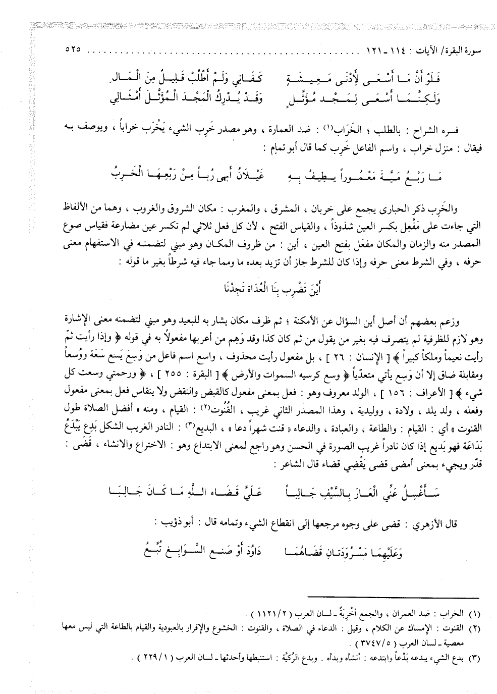 وزعم بعضهم أن أصل أين : السؤال عن الأمكنة . ثم : ظرف مكان يشار به للبعيد ، وهو مبني لتضمنه معنى الإشارة ، وهو لازم للظرفية ، لم يتصرف فيه بغير من يقول : من ثم كان كذا . وقد وهم من أعرهبا مفعولاً به في قوله : ) وَإِذَا رَأَيْتَ ثَمَّ رَأَيْتَ نَعِيماً وَمُلْكاً كَبِيراً ). بل : مفعول رأيت محذوف . واسع : اسم فاعل من وسع يسع سعة ووسعاً ، ومقابلة ضاق ، إلا أن وسع يأتي متعدّياً : ) وَسِعَ كُرْسِيُّهُ السَّمَاوَاتِ وَالاْرْضَ ( ، ( وَرَحْمَتِى وَسِعَتْ كُلَّ شَىْء ). الولد : معروف ، وهو فعل بمعنى مفعول ، كالقبض والنقض ، ولا ينقاس فعل بمعنى مفعول ، وفعله : ولد يلد ولادة ووليدية ، وهذا المصدر الثاني غريب . القنوت : القيام ، ومنه أفضل الصلاة طول القنوت ، أي القيام والطاعة والعبادة والدعاء . قنت شهراً : دعا . البديع : النادر الغريب الشكل . بدع يبدع بداعة فهو بديع ، إذا كان نادراً ، غريب الصورة في الحسن ، وهو راجع لمعنى الابتداع ، وهو الاختراع والإنشاء . قضى : قدّر ، ويجيء بمعنى أمضى . قضى يقضي قضاء . قال : سأغسل عني العار بالسيف جالبا