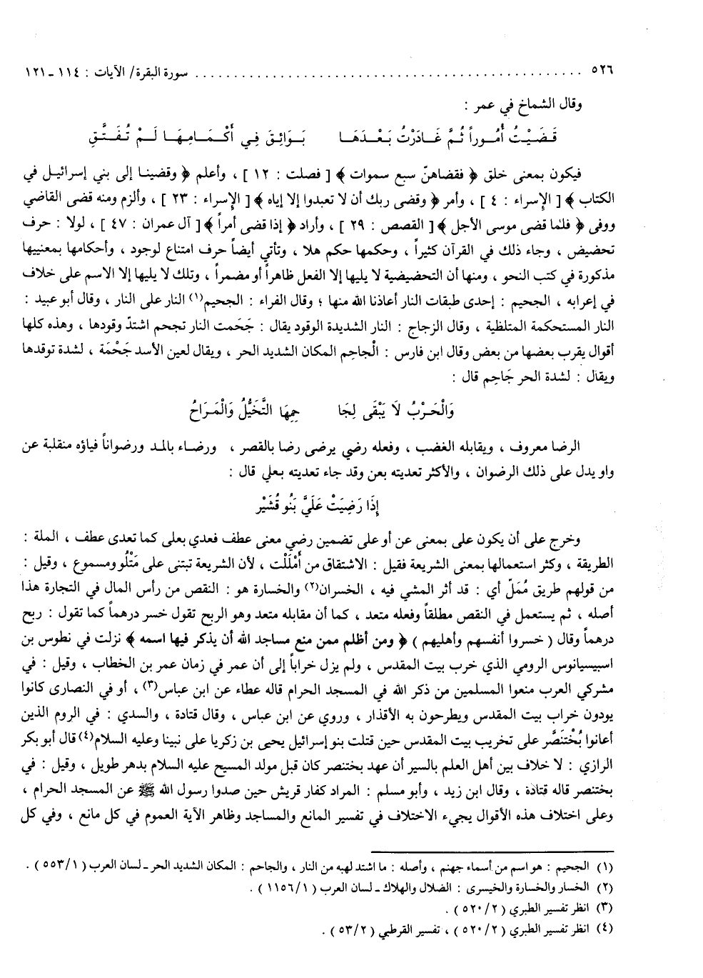 فيكون بمعنى خلق : ) فَقَضَاهُنَّ سَبْعَ سَمَاوَاتٍ ( ، وأعلم : ) وَقَضَيْنَا إِلَى بَنِى إِسْراءيلَ فِى الْكِتَابِ ( ، وأمر : ) وَقَضَى رَبُّكَ أَن لاَّ تَعْبُدُواْ إِلاَّ إِيَّاهُ ( ، وألزم ، منه قضى القاضي ، ووفى : ) فَلَمَّا قَضَى مُوسَى الاْجَلَ ( ، وأراد : ) إِذَا قَضَى أَمْرًا ). لولا : حرف تحضيض ، وجاء ذلك في القرآن كثيراً ، وحكمها حكم هلا ، وتأتي أيضاً حرف امتناع لوجود ، وأحكامها بمعنييها مذكورة في كتب النحو ، ومنها أن التحضيضية لا يليها إلا الفعل ظاهراً أو مضمراً ، وتلك لا يليها إلا الاسم ، على خلاف في إعرابه . الجحيم : إحدى طبقات النار ، أعاذنا الله منها . وقال الفراء : الجحيم : النار على النار . وقال أبو عبيد : النار المستحكمة المتلظية . وقال الزجاج : النار الشديدة الوقود ، يقال جحمت النار تحجم : اشتدّ وقودها . وهذه كلها أقوال يقرب بعضها من بعض . وقال ابن فارس : الجاحم : المكان الشديد الحر ، ويقال لعين الأسد : جحمة ، لشدة توقدها ، ويقال لشدة الحر : جاحم ، قال : والحرب لا يبقى لجا