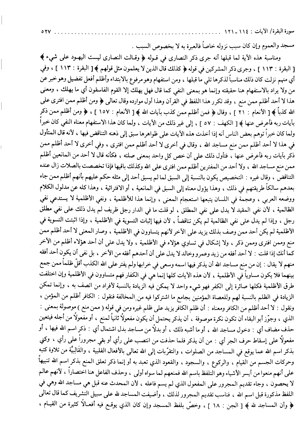ومناسبة هذه الآية لما قبلها : أنه جرى ذكر النصارى في قوله : ) وَقَالَتِ النَّصَارَى لَيْسَتِ الْيَهُودُ عَلَى شَىْء ( ، وجرى ذكر المشركين في قوله : ) كَذالِكَ قَالَ الَّذِينَ لاَ يَعْلَمُونَ مِثْلَ قَوْلِهِمْ ( ، وفي أي نزلت منهم كان ذلك مناسباً لذكرها تلي ما قبلها . ومن : استفهام ، وهو مرفوع بالابتداء . وأظلم : أفعل تفضيل ، وهو خبر عن من . ولا يراد بالاستفهام هنا حقيقته ، وإنما هو بمعنى النفي ، كما قال : ) فَهَلْ يُهْلَكُ إِلاَّ الْقَوْمُ الْفَاسِقُونَ ( ؟ أي ما يهلك . ومعنى هذا : لا أحد أظلم ممن منع . وقد تكرر هذا اللفظ في القرآن ، وهذا أول موارده ، وقال تعالى : ) وَمَنْ أَظْلَمُ مِمَّنِ افْتَرَى عَلَى اللَّهِ كَذِباً ). وقال : ) فَمَنْ أَظْلَمُ مِمَّن كَذَّبَ بِآيَاتِ اللَّهِ ( ؟ ) وَمَنْ أَظْلَمُ مِمَّن ذُكّرَ بِئَايِاتِ رَبّهِ فَأَعْرَضَ عَنْهَا ( ؟ إلى غير ذلك من الآيات . ولما كان هذا الاستفهام معناه النفي كان خبراً ، ولما كان خبراً توهم بعض الناس أنه إذا أخذت هذه الآيات على ظواهرها سبق إلى ذهنه التناقض فيها ، لأنه قال المتأول في هذا : لا أحد أظلم ممن منع مساجد الله ، وقال في أخرى : لا أحد أظلم ممن افترى ، وفي أخرى : لا ؛ أحد أظلم ممن ذكر بآيات ربه فأعرض عنها . فتأول ذلك على أن خص كل واحد بمعنى صلته ، فكأنه قال : لا أحد من المانعين أظلم ممن منع مساجد الله ، ولا أحد من المفترين أظلم ممن افترى على الله ، وكذلك باقيها . فإذا تخصصت بالصلات زال عنده التناقض . وقال غيره : التخصيص يكون بالنسبة إلى السبق ، لما لم يسبق أحد إلى مثله ، حكم عليهم بأنهم أظلم ممن جاء بعدهم ، سالكاً طريقتهم في ذلك ، وهذا يؤول معناه إلى السبق في المانعية ، أو الافترائية . وهذا كله بعد عن مدلول الكلام ووضعه العربي ، وعجمة في اللسان يتبعها استعجام المعنى . وإنما هذا نفي للأظلمية ، ونفي الأظلمية لا يستدعي نفي الظالمية ، لأن نفي المقيد لا يدل على نفي المطلق . لو قلت : ما في الدار رجل ظريف ، لم يدل ذلك على نفي مطلق رجل ، وإذا لم يدل على نفي الظالمية لم يكن تناقضاً ، لأن فيها إثبات التسوية في الأظلمية . وإذا ثبتت التسوية في الأظلمية لم يكن أحد ممن وصف بذلك يزيد على الآخر ، لأنهم يتساوون في الأظلمية . وصار المعنى : لا أحد أظلم ممن منع ، وممن افترى ، وممن ذكر . ولا إشكال في تساوي هؤلاء في الأظلمية . ولا يدل على أن أحد هؤلاء أظلم من الآخر . كما أنك إذا قلت : لا أحد أفقه من زيد وعمرو وخالد ، لا يدل على أن أحدهم أفقه من الآخر ، بل نفي أن يكون أحد أفقه منهم . لا يقال : إن من منع مساجد الله أن يذكر فيها اسمه ، وسعى في خرابها ، ولم يفتر على الله الكذب ، أقلّ ظلماً ممن جمع بينهما ، فلا يكون مساوياً في الأظلمية ، لأن هذه الآيات كلها إنما هي في الكفار ، فهم متساوون في الأظلمية ، وإن اختلفت طرق الأظلمية . فكلها صائرة إلى الكفر ، فهو شيء واحد لا يمكن فيه الزيادة بالنسبة لأفراد من اتصف به ، وإنما تمكن الزيادة في الظلم بالنسبة لهم ، وللعصاة المؤمنين بجامع ما اشتركوا فيه من المخالفة ، فنقول : الكافر أظلم من المؤمن ، ونقول : لا أحد أظلم من الكافر . ومعناه : أن ظلم الكافر يزيد على ظلم غيره . ومن في قوله : ممن منع ، موصولة بمعنى الذي . وجوّز أبو البقاء أن تكون نكرة موصوفة . أن يذكر : يحتمل أن يكون مفعولاً ثانياً لمنع ، أو مفعولاً من أجله ، فيتعين حذف مضاف ، أي دخول مساجد الله ، أو ما أشبه ذلك ، أو بدلاً من مساجد بدل اشتمال ، أي ذكر اسم الله فيها ، أو مفعولاً على إسقاط حرف الجر ، أي من أن يذكر . فلما حذفت من انتصب على رأي ، أو بقي مجروراً على رأي . وكنى بذكر اسم الله عما يوقع في المساجد من الصلوات والتقرّبات إلى الله تعالى بالأفعال القلبية والقالبية ، من تلاوة كتبه ، وحركات الجسم من القيام